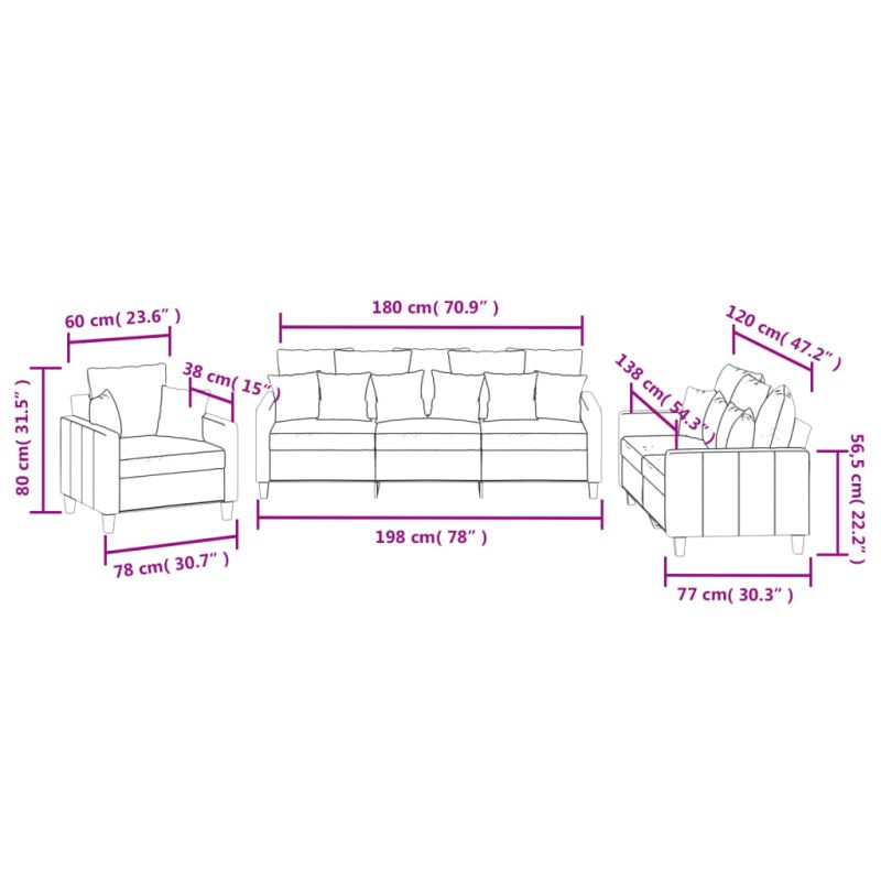 Този комплект дивани е отлично място за вашето време за разговори, четене, гледане на телевизия или просто почивка. Той е предназначен да бъде фокусна точка във вашия дом. Издръжлив текстил: Материята се отличава със семпъл и изчистен вид, като същевременно остава дишаща и дълготрайна.Здрава и стабилна рамка: Шперплатът и металната рамка на седалката на дивана осигуряват здравина и стабилност.Удобна седалка: Диванът е много удобен с дебело подплатената седалка, подлакътниците и възглавниците за гърба.Практични възглавници за диван: Тези квадратни декоративни възглавници не само освежават интериора, но и добавят допълнителен комфорт, докато седите или лежите. Максимално 110 кг на седалка. Съобразете се с риска от открит огън и други източници на силна топлина в близост до продукта.