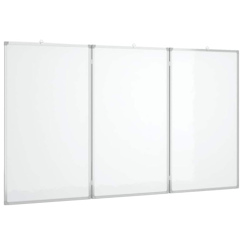 Тази сгъваема магнитна бяла дъска е идеално решение за създаване на място във вашия дом или офис, където да пишете бележки, да рисувате или окачате снимки. Гладка повърхност: Магнитната бяла дъска има гладка повърхност, покрита с лак, върху която се пише и почиства лесно. Освен това можете да прикрепите документи, снимки и други елементи с магнити.Лесно инсталиране: Магнитната бяла дъска се предлага с 3 подвижни куки, които можете да регулирате според вашите нужди и бързо да инсталирате на всяка стена на желаното от вас място.Сгъваема: Магнитната бяла дъска се състои от два шарнирни панела, които осигуряват повече място за писане и могат да бъдат наклонени и сгънати за вашите нужди.Безопасност: Магнитната бяла дъска разполага със здрава алуминиева рамка и метален заден панел, допълнен със защитни капаци във всичките четири ъгъла, за да се гарантира безопасността на потребителя.Множество приложения: Магнитната бяла дъска служи като универсален инструмент за презентации и бележки. Подходяща е за училища, конферентни зали, офиси и домове.