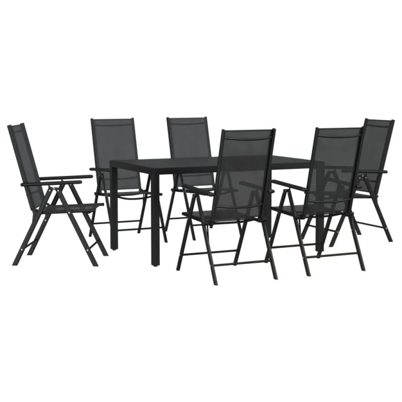 Този практичен, но стилен градински трапезен комплект е идеален за отдих или вечеря във вашата градина или вътрешен двор. Дишащ материал: Седалките са удобни с дишащ текстилен. Текстиленът позволява на въздуха да преминава свободно през него, като същевременно е устойчив на UV лъчи. Това прави текстилена идеален за горещо време. Тъй като е траен и здрав материал, той е изключително устойчив на разкъсване, пробиване и мухъл.Здрава рамка: Прахово боядисаната алуминиева рамка прави трапезния комплект здрав и издръжлив за използване на открито.Регулируема облегалка: Градинският трапезен стол се регулира в 7 позиции, така че винаги да намерите най-удобната позиция.Сгъваема функция: Накланящият се стол може да се сгъва, за да спести място, когато не се използва.Практична маса: Трапезната маса разполага с WPC плот, който се почиства лесно и е подходящ за използване на открито. Здравият плот е идеален за поставяне на ястия, напитки, вази, купи с плодове или други декоративни елементи. Добре е да се знае:За да сте сигурни, че вашите външни мебели ще останат красиви, ви препоръчваме да ги защитите с водоустойчиво покривало. Максимално 110 кг на седалка.