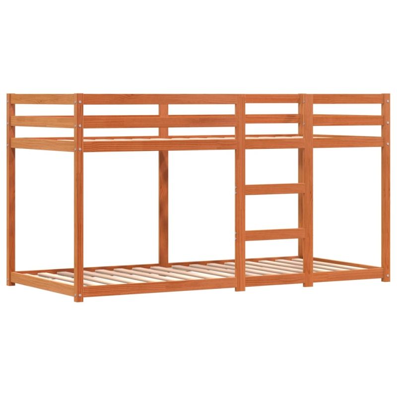 Това дървено двуетажно легло е елегантно и функционално, което го прави идеално допълнение към всяка стая с ограничено пространство. Масивно борово дърво: Това двуетажно легло е изработено от масивно борово дърво за стабилност и издръжливост. Боровата дървесина е с продълговати шарки, а чеповете придават на материала характерния му рустик вид.Страхотно забавление: Можете да комбинирате завесите с ниското двуетажно легло, за да създадете тайната база на вашето дете, осигурявайки страхотно забавление преди лягане и добавяйки фокусна точка към спалнята!Предпазни парапети: Горното легло се предлага с предпазни парапети от всичките 4 страни, така че детето ви да може да спи, без да се притеснявате, че ще падне.Удобна стълба: Това двойно двуетажно легло има стълба, която осигурява удобство за качване и слизане от леглото. Освен това носи радост и превръща стаята им в закрита детска площадка. Добре е да се знае:Към това легло не е включен матрак. Ние предлагаме разнообразна селекция от матраци. Можете да проверите нашия магазин за подходящ матрак. Внимание:За да предотвратите преобръщане, този продукт трябва да се използва с предоставеното устройство за закрепване на стена. ПРЕДУПРЕЖДЕНИЕ. Това легло не е подходящо за деца под шест години поради риск от нараняване при падане ПРЕДУПРЕЖДЕНИЕ. Двуетажните легла/високите легла могат да представляват сериозен риск от нараняване от задушаване, ако не се използват правилно. Никога не прикрепвайте и не закачайте към която и да е част на двуетажното легло/високото легло предмети, които не са предназначени за използване с леглото, например, но не само, въжета, струни, шнурове, куки, колани и чанти ПРЕДУПРЕЖДЕНИЕ. Децата могат да попаднат в капан между леглото и стената, скатния покрив, тавана, съседни мебели (напр. шкафове) и други подобни. За да се избегне рискът от сериозни наранявания, разстоянието между горната предпазна преграда и прилежащата конструкция не трябва да надвишава 75 мм или трябва да е повече от 230 мм ПРЕДУПРЕЖДЕНИЕ. Не използвайте двуетажното легло/високото легло, ако някоя конструктивна част е счупена или липсва. ПРЕДУПРЕЖДЕНИЕ. Този продукт трябва да бъде прикрепен към стена или строителна конструкция.