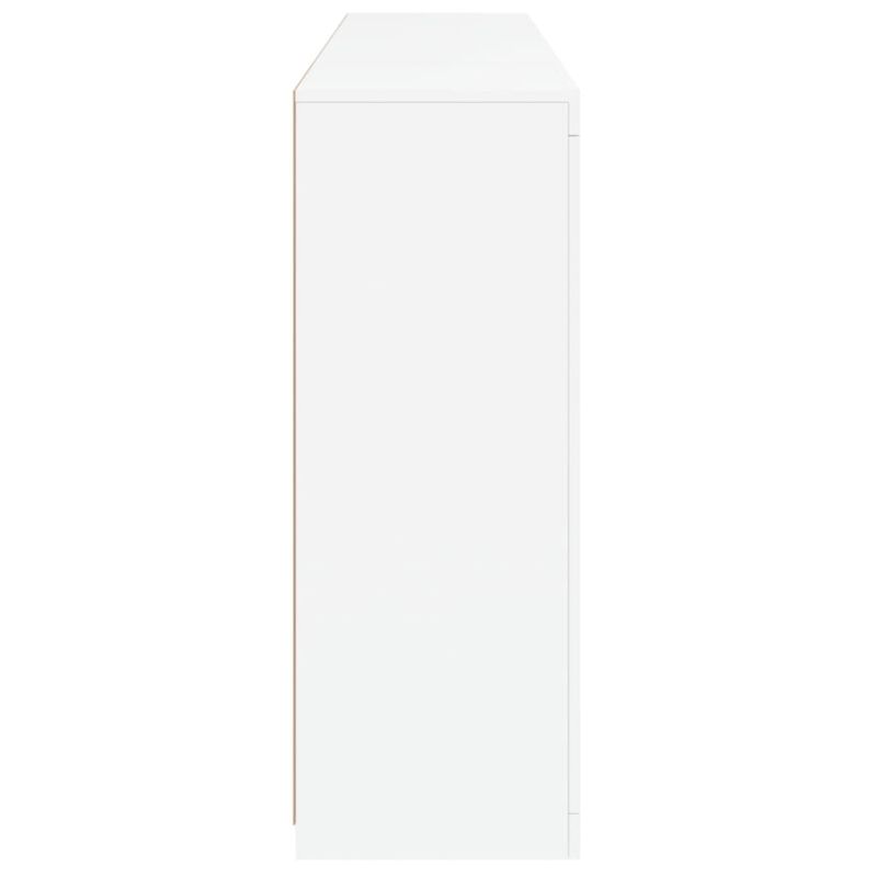 Украсете стаята си с тези модерни бюфет с LED светлини, които се съчетават лесно с мебели във всеки стил във вашия дом. Издържлив материал: Инженерната дървесина е с изключително качество с гладка повърхност и се отличава със здравина, стабилност и устойчивост на влага.Достатъчно място за съхранение: Тези сайдборди осигуряват много място за съхранение, за да държите вашите списания, книги, дистанционни управления и други дребни предмети добре организирани и леснодостъпни.Декоративна функция: Здравият плот на бюфетните шкафове е идеален за излагане на декоративни предмети, фоторамки или саксийни растения.Регулируеми LED светлини: Тези шкафове за съхранение са оборудвани с RGB LED светлини, които имат различни менюта за промяна на цвета на светлината и автоматично регулиране, украсявайки дома ви цветен и красив. Внимание:За предотвратяване на преобръщане този продукт трябва да се използва с предоставения анкер за стена.Добре е да се знае:Продуктът има USB конектор, който изисква сертифициран 5V USB захранващ източник (не е включен). Не използвайте този артикул, ако някой от компонентите е счупен, скъсан или липсва. Този продукт се захранва с DC 5V, но сертифицираният 5V USB източник на захранване не е включен в комплекта. По-високото напрежение може да доведе до прегряване на устройството и да доведе до повреда на устройството и потенциален риск от прегряване и пожар.