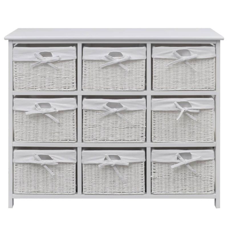 Този зашеметяващ шкаф, изработен от висококачествен материал, се отличава със семпъл, но стилен дизайн. Той не само ще поддържа вещите ви спретнато организирани, но и ще подобри декора на стаята ви. Този модул за съхранение има 9 плетени кошници, а всяка кошница е с подложка от плат, която може да се пере. Тази мебел е с бяло покритие, което я прави издръжлива и лесна за почистване. Този красив, многофункционален шкаф представлява идеално решение за съхранение за всяка стая във вашия дом.