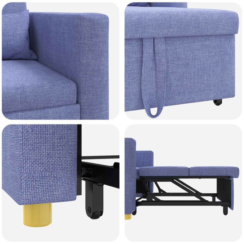 Този 3-в-1 конвертируем диван предлага перфектната комбинация от стил и практичност, отлично пригоден за съвременни жилищни пространства. Със свежия си дизайн и умни функции, той е идеален за апартаменти или малки всекидневни, където оптимизацията на пространството е важна. Изработен е така, че да допълните атмосферата на всяка стая, този диван предлага многофункционалност с иновативния си дизайн, който го прави централна точка в дома ви. С изисканото си покритие и удобни седалки, той приканва към релаксация, без да губи изящество. Идеален е за тези, които искат практичен елемент, който се адаптира към начина им на живот, преминавайки от комфортен фотьойл към легло за гости, без да се жертва стилът.”]},{ Материали: Този диван е изработен от текстил, предоставящ мека и приятна на допир повърхност. Устойчивата стоманена конструкция предлага здравина и издръжливост, съвместно с концепцията за модерност и устойчивост. Шперплатът добавя допълнителна стабилност. Тези материали работят в тандем, за да представят продукт, който е не само стилен, но и здрав, осигурявайки комфорт за редовна употреба. Включени компоненти: Диванът идва с облегалка за кръста, замислена за допълнителна подкрепа, която увеличава комфорта при продължително седене или релаксация. Облечена в плюш, облегалката осигурява допълнителна поддръжка, запазвайки луксозното усещане. Подлакътниците и седалката са от полиестер, комбинирайки здравина с меко усещане, допринасяйки за общия комфорт. Завършващата задна част на дивана гарантира, че е представителен от всякакви ъгли, запазвайки визуалната си привлекателност навсякъде. Функции/функционалност/дизайн: С иновативен 3-в-1 механизъм, този диван предлага безприколно преминаване между два режима: фотьойл, облегалка и легло. Поради тази гъвкавост е отличен избор за малки пространства, предлагайки важните функционалности, без нужда от допълнително пространство. Дизайнът му е в стил чисти линии и минимална декорация, съобразен с модерния вкус. Препоръчителни приложения: Разработен за вътрешна употреба, този продукт е най-подходящ за всекидневни или стаи за гости, където многофункционалните мебели са от съществено значение. Способността му да се трансформира безпроблемно от седален към спален ареал го прави особено привлекателен за обитатели на апартаменти или за тези с ограничено пространство. Поддръжка и запазване: Поддържането на този диван е лесно, тъй като единственото необходимо е минимално почистване, за да запази вида си. Редовното прахосмукиране спомага за запазване на цвета и текстурата на тъканта. Избягвайте прекомерно търкане или агресивни почистващи средства, за да осигурите дълготрайност, като се уверите, че елегантният му вид остава запазен с основна поддръжка.