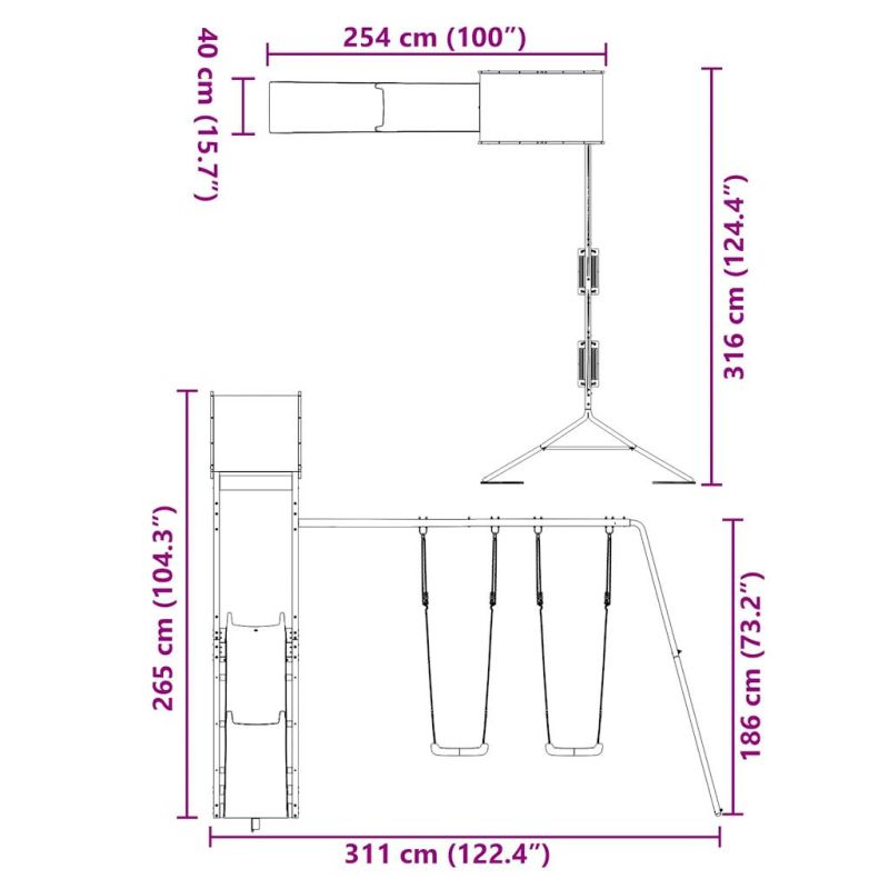 Искате ли да дадете на децата си свободата да играят у дома? Това дървено комбинирано детско съоръжение за игра на открито превръща задния ви двор в детска площадка за изпълнени с фантазия приключения! Издръжлив материал: Това градинско съоръжение за игра е изработена от борова дървесина, импрегнирана с вакуум. Масивната борова дървесина е известна със своята здравина и издръжливост. Нейните прави зърна и отличителни възли допринасят за рустик чара ѝ. Тя е импрегнирана с консервиращ разтвор и е подложена на автоклавно третиране, което повишава устойчивостта ѝ на гниене и атмосферни влияния.Стабилна дървена рамка: Дървената рамка на градинската къща за игра осигурява здравина и стабилност. Освен това крачетата във формата на буквата "А" на детската люлка позволяват баланс.Многофункционални центрове за дейности: Катерушката разполага с платформа с височина 118 см и се отличава с вълнообразна пързалка, две люлки, както и с пясъчници. Вашите деца могат да поканят и своите приятелчета да се присъединят към забавлението.Внимателно разработен дизайн: Околните дървени парапети са проектирани така, че да гарантират безопасността на децата по време на веселите им игри. Освен това покривът на облачета осигурява сянка за вашите деца в горещите летни дни.Безкрайно забавление: Този дървен комплект за игра на открито, който предлага много забавления, е идеалният начин децата ви и техните приятели да играят, да прекарват повече време в общуване и да създават спомени с вас! Внимание:Само за домашна употребаИзползване на откритоНе е подходяща за деца под 3 годиниПрепоръчителна възраст на потребителя: 3-8 години Предупреждение. Не е подходящ за деца под 3 години. Само за домашна употреба. GPSR