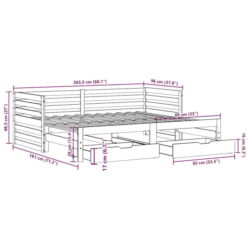 Това канапе 2-в-1 с изтеглящо разтегателно легло, което служи едновременно като диван и легло, е практично и атрактивно допълнение към вашата всекидневна или спалня. Стабилна и дълготрайна рамка: Масивната борова дървесина е известна със своята здравина и издръжливост. Нейните прави зърна и отличителни възли допринасят за рустик чара ѝ.Функционална мебел: Канапето функционира като диван през деня и лесно се превръща в двойно легло през нощта чрез издърпване на механизма за изтеглящо разтегателно легло, осигурявайки удобно решение за настаняване на гости и увеличаване на пространството.Ламели за оптимална опора: Диванът е снабден с ламели, за да предложи основна опора и дишане на вашия матрак.Достатъчно място за съхранение: Това легло за гости има две чекмеджета, които осигуряват достатъчно място за съхранение на вашите дрехи, чорапи, играчки, възглавници и др. Добре е да се знае:Матраците не са включени в това легло. Ние предлагаме разнообразна селекция от матраци. Можете да проверите нашия магазин за подходящи матраци.