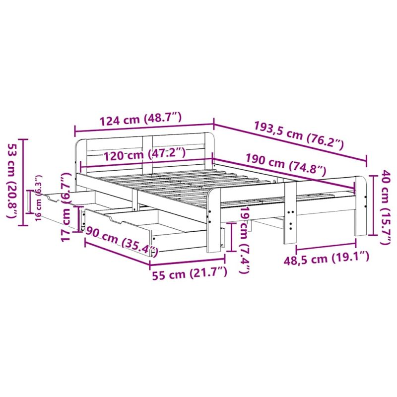 Осигурете си по-добър спокоен нощен сън с тази рамка за легло! Тя представлява приветливо допълнение към всяка спалня. Стабилна и дълготрайна рамка: Масивната борова дървесина е известна със своята здравина и издръжливост. Нейните прави зърна и отличителни възли допринасят за рустик чара ѝ.Решетъчна основа за оптимална опора: Рамката на леглото е оборудвана с решетъчна основа за опора и дишане на вашия матрак.Използвайте пълноценно пространството: Тази основа за легло разполага с две чекмеджета отдолу, осигуряващи съхранение на предмети като допълнително спално бельо, сезонни дрехи и играчки.Гъвкава табла: Тази рамка за легло се предлага с табла, която осигурява отлична опора за гърба, когато седите в леглото, за да четете или гледате телевизия, като същевременно служи и като декоративен елемент.Маневреност без усилие: Това чекмедже за съхранение под леглото разполага с четири колелца, осигуряващи плавна и лесна маневреност за плъзгане и изваждане под леглото ви. Добре е да се знае:Към това легло не е включен матрак. Ние предлагаме разнообразна селекция от матраци. Можете да проверите нашия магазин за подходящ матрак.