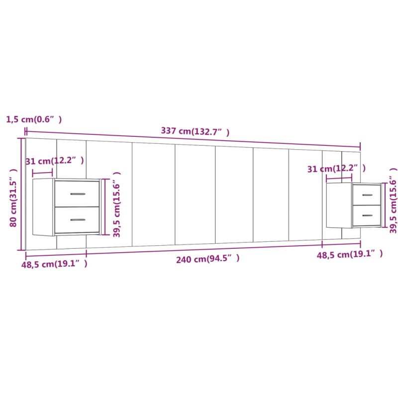 Здравата табла за легло с шкафчета и класически дизайн придава завършен вид на рамката на леглото и е подходяща за всяка спалня. Издържлив материал: Инженерната дървесина е с изключително качество с гладка повърхност и също така се отличава със здравина, стабилност и устойчивост на влага.Дизайн за стенен монтаж: Окачените нощни шкафчета и таблата могат да бъдат монтирани на стена. По този начин можете да увеличите максимално площта на пода и да поддържате пространството подредено.Място за съхранение: Нощното шкафче разполага с просторно място за съхранение, което ви позволява да държите нещата си организирани. Внимание:Винт(ове) и щепсел(и) за вътрешността на стената не са включени. Търсете и използвайте винт(ове) и дюбел(и), подходящи за вашите стени. Ако не сте сигурни, потърсете професионална помощ. Прочетете и следвайте внимателно всяка стъпка от инструкциите.