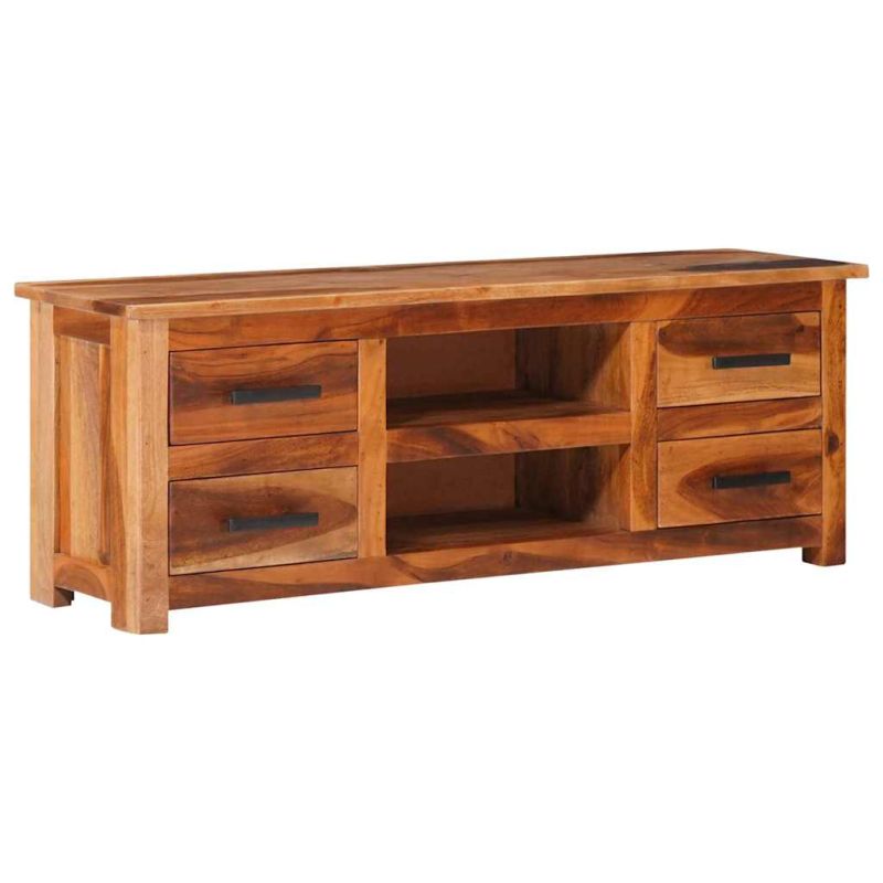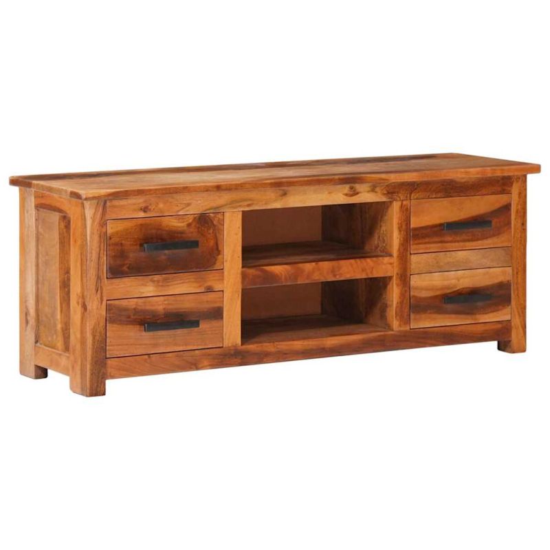 Дървеният ТВ шкаф излъчва рустик чар. Той ще бъде истински акцент на вашия интериор. Сайдбордът е изработен от масивно дърво, което го прави издръжлив и красив. Освен това не се деформира или цепи и се отличава с естествена устойчивост на гниене. Ето защо този красиво проектиран нисък шкаф е изключително стабилен, издръжлив и впечатляващ. Перфектната изработка гарантира, че всяка стъпка от процеса на производство се извършва с най-голямо внимание – било то полиране или лакиране. Стерео шкафът е изцяло ръчно изработен, а естетически привлекателните дървесни шарки правят всяка мебел отличителна и малко по-различна от другите. Този HiFi шкаф разполага с 4 чекмеджета и 2 отделения, осигуряващи достатъчно място за съхранение на вашите мултимедийни уреди, книги, както и различни други предмети. Този продукт вече е сглобен; не се изисква сглобяване. Важна забележка: Дървесните зърна варират, което прави всеки артикул уникален. Доставката е на случаен принцип, което гарантира ексклузивността и индивидуалността на вашия продукт.