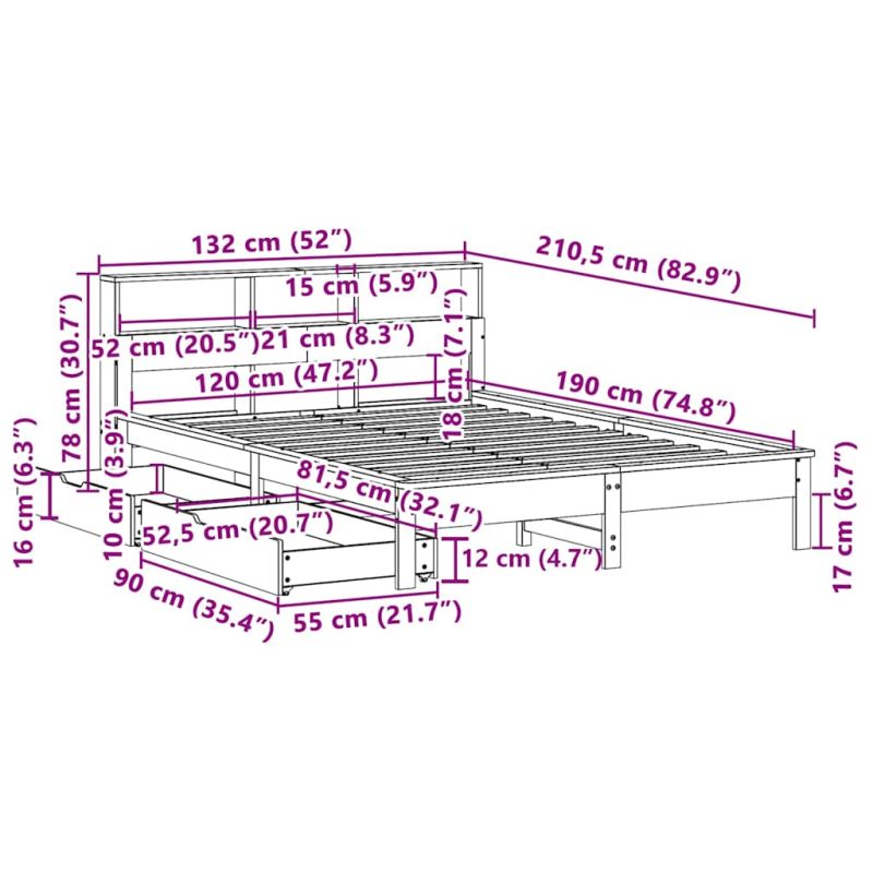 Легло с етажерка за книги, без матрак, 120x190 см, бор масив