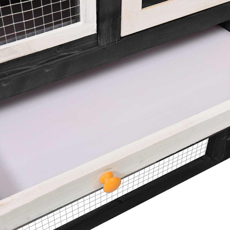Тази дървена клетка за зайци на 2 нива осигурява уютно и комфортно място за отглеждане на дребни животни, особено на сладки зайчета. Тя може да се използва за многобройни приложения: игра, упражнения, обучение или просто да поддържа безопасността на домашните ви любимци. Тази клетка за зайци осигурява на вашите домашни любимци достатъчно пространство за упражнения, докато стегнатата стоманена телена мрежа помага за предотвратяване на пакости и неочаквани инциденти. Същевременно конструкцията с решетка от стоманена тел ви предоставя възможност за наблюдение на домашните любимци и им позволява да следят околността и да получават достатъчно чист въздух. Фермерската къща за зайци позволява достъп през 2 врати и е изградена от чамово дърво масив, което я прави стабилна и издръжлива. При това наклоненият зелен покрив е покрит с водоустойчива материя и предпазва от дъжд. За лесно почистване на клетката за зайци е включено чекмедже, облицовано с ламарина. Къщата за зайци предлага перфектната зона за спане. Освен това рампата за лесно изкачване води от долния към горния етаж, а издърпващата се тава улеснява почистването. Важна забележка: Препоръчваме поставянето на клетката за зайци под навес. Това ще удължи експлоатационния ѝ живот.
