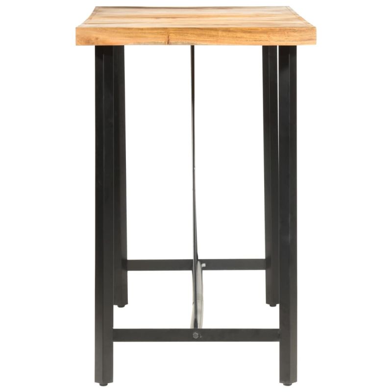 Този красив бар комплект има индустриален дизайн и ще бъде впечатляващо допълнение към всеки дом, бар или ресторант. Бар масата е изработена от акациево дърво масив, което е трайно, стабилно и лесно за почистване. Тя е изцяло ръчно изработена, а красивите дървени шарки правят всяка мебел уникална и малко по-различна от следващата. Здравите стоманени крака правят масата много стабилна и издръжлива и допринасят за невероятния ѝ индустриален стил. Важна забележка: Шарките и цветовете на дървото могат да варират, което прави всяка мебел уникална. Доставката е на случаен принцип. Бар табуретките са тапицирани с мека естествена кожа и текстил, което ги прави изключително издръжливи и удобни. Стабилните стоманени крака правят табуретките много здрави и допринасят за невероятния им индустриален стил.
