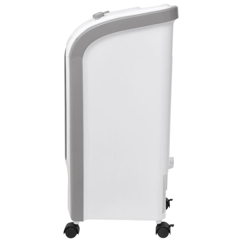 Този преносим въздушен охладител 3-в-1 е ефективен вентилатор, който ще ви осигури хладен въздух. Той може да се използва и като овлажнител за регулиране на влагата при зимна сухота. Охлаждащият ефект се постига чрез изпаряване на вода/лед от 4-литровия воден резервоар без фреон. Благодарение на 3 настройки на скоростта можете лесно да регулирате въздушния поток. Вдлъбнатата дръжка и колелцата улесняват транспортирането. Можете също да използвате нашия въздушен охладител на открито. Този уред не е предназначен за използване от лица (включително деца) с намалени физически, сетивни или умствени способности или с недостатъчен опит и познания, освен ако не са получили надзор или инструкции за използването на уреда от лице, отговорно за тяхната безопасност. Този продукт не е играчка. Не позволявайте на деца да си играят с уреда.