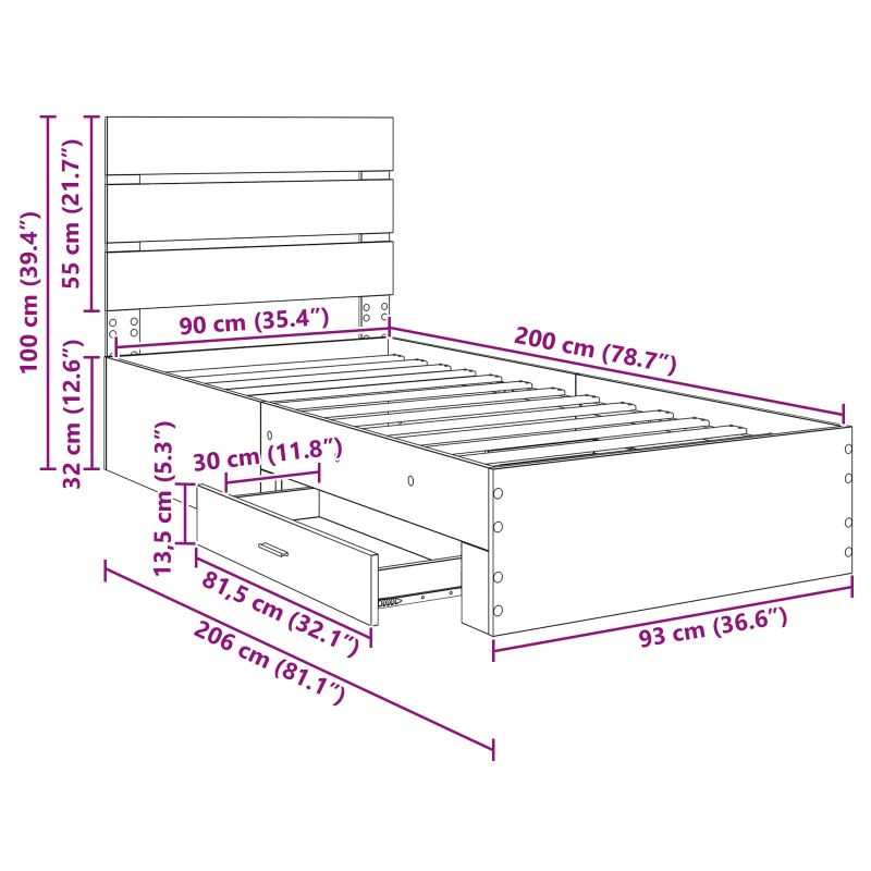 Рамка за легло с таблото Сив Сонома 90 x 200 cm Инженерно дърво
