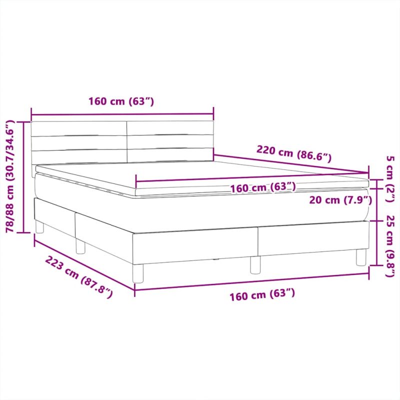 Използвайте това боксспринг легло, за да се насладите на спокоен сън! Предлага ви максимален релакс и приятен сън. Мек и удобен материал: Кадифената материя се отличава с мека и гладка повърхност, която създава приятно усещане върху кожата, като ви носи топлина и максимален комфорт.Матрак с джоб пружини: Този матрак с джоб пружини има индивидуални пружини с джобчета, които работят независимо, за да осигурят персонализирана опора, като реагират само на натиска във всяка област. Този дизайн предотвратява "свличането" към средата на матрака и намалява прехвърлянето на движение в сравнение с традиционните матраци с отворени намотки. Всяка покет пружина поддържа тялото индивидуално.Табла с регулируема височина: Таблата се регулира на височина, за да отговаря на вашите предпочитания.Удобен горен матрак: Този топ матрак подобрява опората и комфорта със своята мека, дишаща повърхност, като същевременно удължава живота на вашия матрак. Подвижният му калъф позволява лесно изпиране, което прави поддръжката лесна.Ламели за оптимална опора: Рамката на леглото е пълна с ламели, за да предложи нужните опора и дишане за вашия матрак. Добре е да се знае:От хигиенни съображения матракът не може да бъде върнат, ако опаковката е отстранена или отворена.