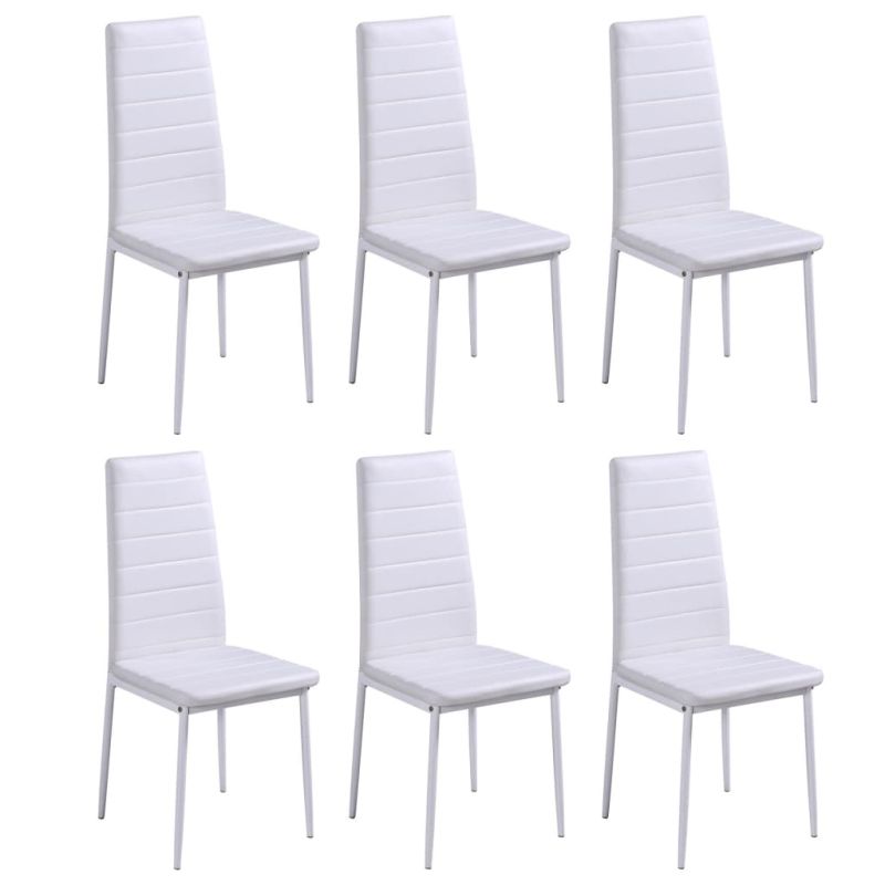 Този трапезен комплект, състоящ се от 7 части, има елегантен, модерен дизайн и е идеален за тези, които търсят да добавят стилно докосване към своя интериор. Плотът на масата е изработен от закалено стъкло с висока якост, което се почиства лесно. Всеки стол е тапициран с висококачествена изкуствена кожа. Гъвката, подплатена седалка е много удобна. Доставката включва 1 маса и 6 стола.