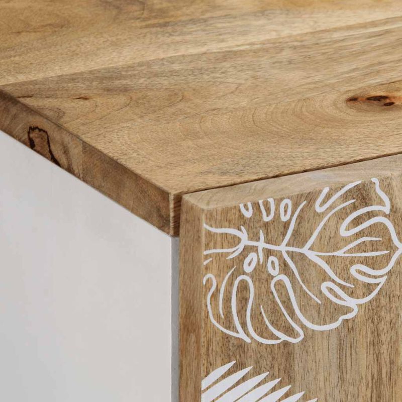 Този бюфет предлага едновременно декоративна визия и практично място за съхранение, което го прави идеално допълнение към дома ви. Здрав и стабилен материал: Масивното мангово дърво, здрава тропическа твърда дървесина, е силно предпочитано за производството на мебели поради изключителната си издръжливост и здравина. Красивите ѝ дървесни шарки правят всяка мебел малко по-различна от следващите.Голямо пространство за съхранение: Шкафът предлага достатъчно място за съхранение на продукти за хранене и други домакински вещи, за да бъдат те подредени и на една ръка разстояние.Здрав плот: Шкафът на бюфета има здрав плот, върху който можете да поставите декоративни предмети, фотоалбуми или малки растения.Широки приложения: Можете да използвате този страничен шкаф като шкаф за баня или кухненски шкаф, или просто като елегантен шкаф за съхранение в спални, тоалетни, антрета, коридори и офиси, трапезарии и други жилищни помещения. Добре е да се знае:Всеки артикул е уникален с вариации в цветове и зърна. Доставката е на случаен принцип, което гарантира ексклузивността и индивидуалността на вашия продукт. Внимание:За да предотвратите преобръщане, този продукт трябва да се използва с предоставеното устройство за закрепване на стена.