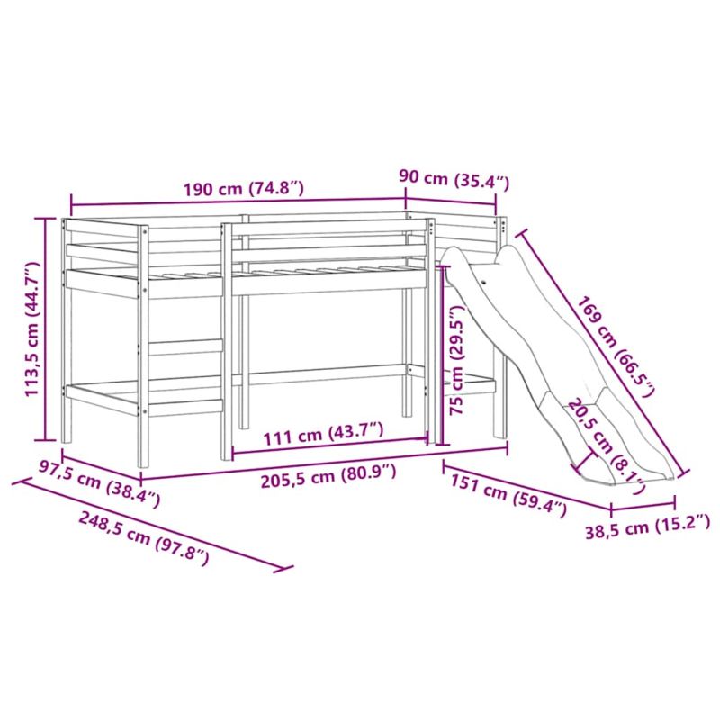 Това детско високо легло е изработено от борова дървесина масив и е предназначено както за забавление, така и за оптимизиране на пространството. Стабилна дървена конструкция: Това средновисоко легло е изработено от масивна борова дървесина за стабилност и издръжливост. Боровата дървесина е с продълговати шарки, а чеповете придават на материала характерния му рустик вид. Пълно използване на пространството: Това единично високо легло е повдигнато на 87 см над земята, осигурявайки достатъчно пространство отдолу за съхранение или други дейности. Тази зона може да се използва за подреждане на кутии за съхранение, съхраняване на големи играчки или дори за поставяне на детски диван за четене. Освен това вашето дете може да използва пространството под дървената рамка на леглото като тайна база и да се наслаждава на въображаема игра. Предпазни парапети: Детската спалня със средна височина се предлага с предпазни парапети от всичките 4 страни, така че детето ви да може да спи, без да се притеснявате, че ще падне. Удобна стълба и пързалка: Това детско легло със средно легло има забавна пързалка, която носи радост и превръща стаята им във вътрешна детска площадка. Комбинацията от стълба за катерене и пързалка прави лягането по-вълнуващо и интересно за децата. Добре е да се знае:Към това легло не е включен матрак. Ние предлагаме разнообразна селекция от матраци. Можете да проверите нашия магазин за подходящ матрак. Внимание:За предотвратяване на преобръщане този продукт трябва да се използва с предоставения анкер за стена. ПРЕДУПРЕЖДЕНИЕ. Това легло не е подходящо за деца под шест години поради риск от нараняване при падане. ПРЕДУПРЕЖДЕНИЕ. Двуетажните легла/високите легла могат да представляват сериозен риск от нараняване от задушаване, ако не се използват правилно. Никога не прикрепвайте и не закачайте към която и да е част на двуетажното легло/високото легло предмети, които не са предназначени за използване с леглото, например, но не само въжета, конци, шнурове, куки, колани и чанти ПРЕДУПРЕЖДЕНИЕ. Децата могат да попаднат в капан между леглото и стената, скатния покрив, тавана, съседни мебели (напр. шкафове) и други подобни. За да се избегне рискът от сериозни наранявания, разстоянието между горната предпазна преграда и съседната конструкция не трябва да надвишава 75 мм или да е повече от 230 мм; ПРЕДУПРЕЖДЕНИЕ. Не използвайте двуетажното легло/високото легло, ако някоя конструктивна част е счупена или липсва. ПРЕДУПРЕЖДЕНИЕ. Този продукт трябва да бъде прикрепен към стена или строителна конструкция.