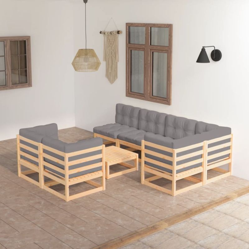 Градински лаундж комплект, 8 части, с възглавници, масив бор