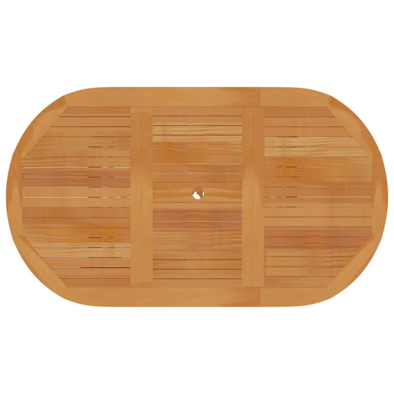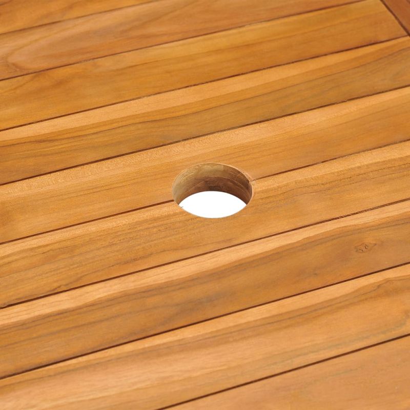Тази дървена градинска маса се отличава с елегантен дизайн и е отличен избор за употреба на закрито или открито. Тази мебел от тик е изработена от изключително издръжлива тикова твърда дървесина, която е суха – изсушена в пещ, а след това фино шлифована, за да ѝ се придаде много гладък вид. Тиковото дърво е известно с изключителната си здравина и устойчивост на атмосферни влияния, което го прави далеч по-подходящо за градински мебели от всеки друг вид дърво. Тиковата дървесина е идеалният избор, ако искате да закупите дълготрайна градинска мебел. Благодарение на шлифованата повърхност трапезната маса е устойчива на атмосферни влияния и лесна за почистване. Плотът на масата има отвор за чадър, за да осигури защита срещу слънцето, така че да можете да се насладите на летния бриз.