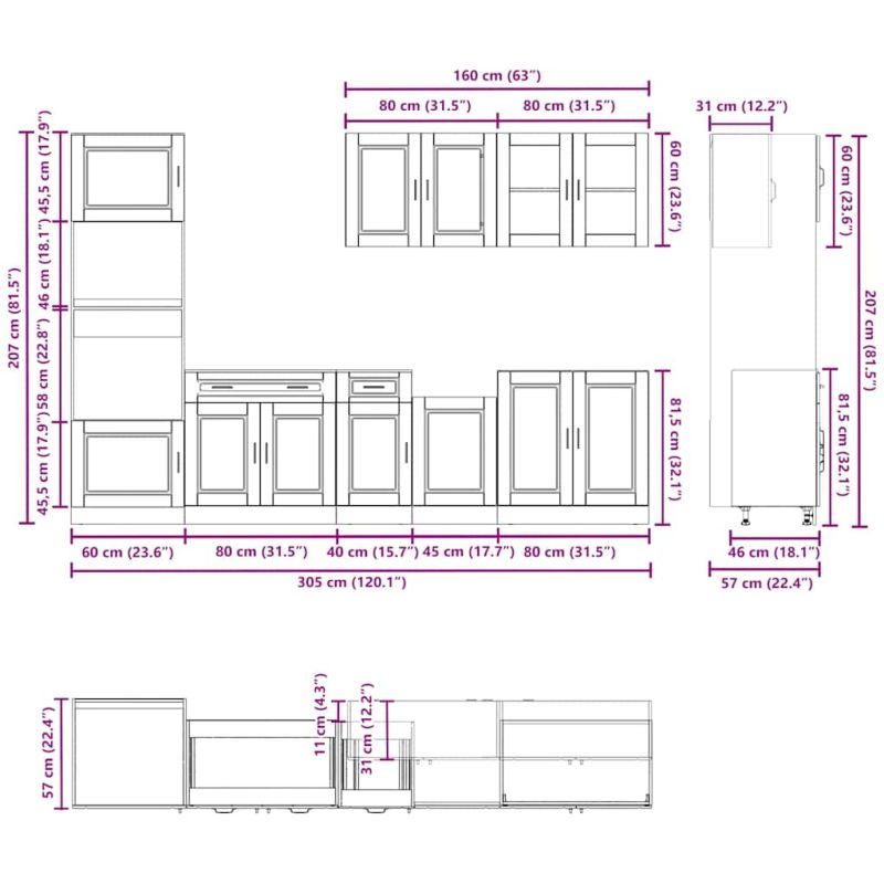 Този комплект кухненски шкафове от 7 части с елегантен дизайн оптимизира вашето кухненско пространство и осигурява достатъчно място за съхранение на вашите принадлежности! Стабилен и издръжлив материал: Инженерната дървесина е издръжлив и стабилен материал с гладка повърхност, която е устойчива на влага, изкривяване и разцепване, което я прави надежден избор за различни проекти.Голямо пространство за съхранение: Комплектът кухненски шкафове има много отделения и предлага достатъчно място за съхранение на купи, чинии, тенджери и други кухненски уреди.Регулируеми крачета: Долните шкафове са снабдени с регулируеми крачета, чиято височина може да се регулира според разположението на кухнята.Лесна поддръжка: Благодарение на гладката си повърхност тези кухненски шкафове се почистват лесно с влажна кърпа и изискват по-малко поддръжка. Внимание:За да предотвратите преобръщане, този продукт трябва да се използва с предоставеното устройство за закрепване на стена. Добре е да се знае:Винт(ове) и щепсел(и) за вътрешността на стената не са включени. Търсете и използвайте винт(ове) и дюбел(и), подходящи за вашите стени. Ако не сте сигурни, потърсете професионална помощ. Прочетете и следвайте внимателно всяка стъпка от инструкциите.Работният плот, мивката и смесителят не са включени в доставката.