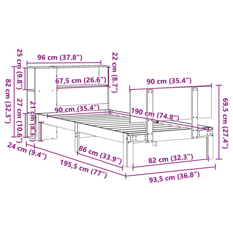 Осигурете си по-добър и спокоен сън с това легло с етажерка за книги! То представлява приветливо допълнение към всяка спалня. Стабилна и дълготрайна рамка: Масивната борова дървесина е известна със своята здравина и издръжливост. Нейните прави зърна и отличителни възли допринасят за рустик чара ѝ. Решетъчна основа за оптимална опора: Рамката на леглото е оборудвана с решетъчна основа за опора и дишане на вашия матрак. Голямо пространство за съхранение: Тази табла с етажерка за книги предлага достатъчно място за съхранение на книги, декоративни предмети или лични вещи на леснодостъпно място, което намалява безпорядъка в спалнята. Практична табла за крака: Таблата за крака не само допринася за цялостната стабилност на рамката на леглото, осигурявайки безопасна среда за спане, но също така закрепва матрака на място и предотвратява падането на одеяла, чаршафи и други постелъчни материали от края на леглото, поддържайки спретнат вид. Спестяване на място: Тази табла е опция за спестяване на място, която може да замени нуждата от нощно шкафче, като помага да увеличите максимално пространството на вашата спалня и я прави идеална за малки или ограничени пространства. Добре е да се знае:Към това легло не е включен матрак. Ние предлагаме разнообразна селекция от матраци. Можете да проверите нашия магазин за подходящ матрак.