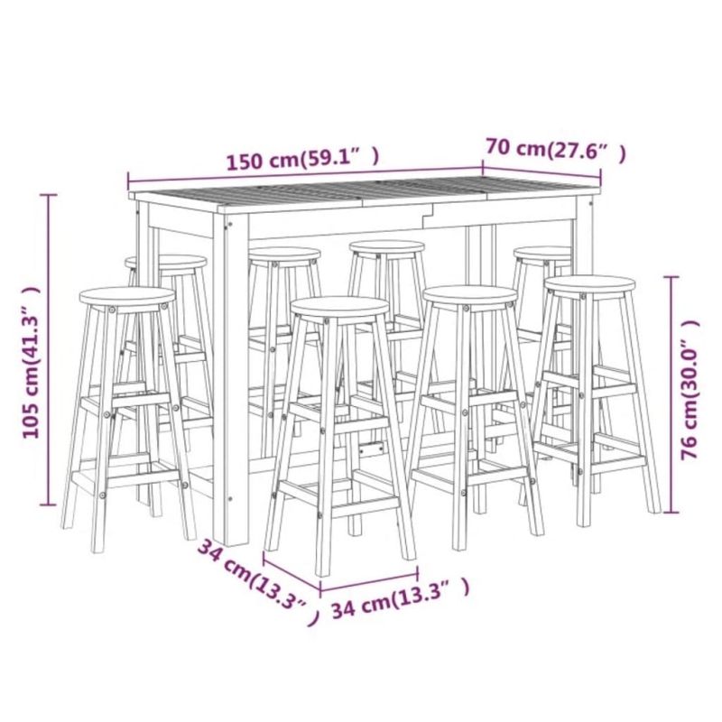 Този дървен градински бар комплект има елегантен дизайн и е създаден да бъде централната точка на вашата градина, вътрешен двор или тераса. Практичен материал: Масивното акациево дърво е красив естествен материал. Акациевото дърво е тропическа твърда дървесина, която е плътна, здрава и издръжлива. Освен това повърхността с маслен финиш улеснява почистването на градинската маса и столове.Здрава и стабилна структура: Дървените рамки на трапезния комплект за открито осигуряват здравина и стабилност.Удобни бар столове: Опорите за крака осигуряват допълнителен комфорт при седене.Неостаряващ външен вид: Елегантният дизайн на дървената бистро маса и табуретки ги прави неостаряваща инвестиция за вашия дом. Забележка:Забележка: За да удължите живота на вашите градински мебели, ви препоръчваме да ги защитите с водоустойчиво покритие. Максимално 110 кг на седалка.