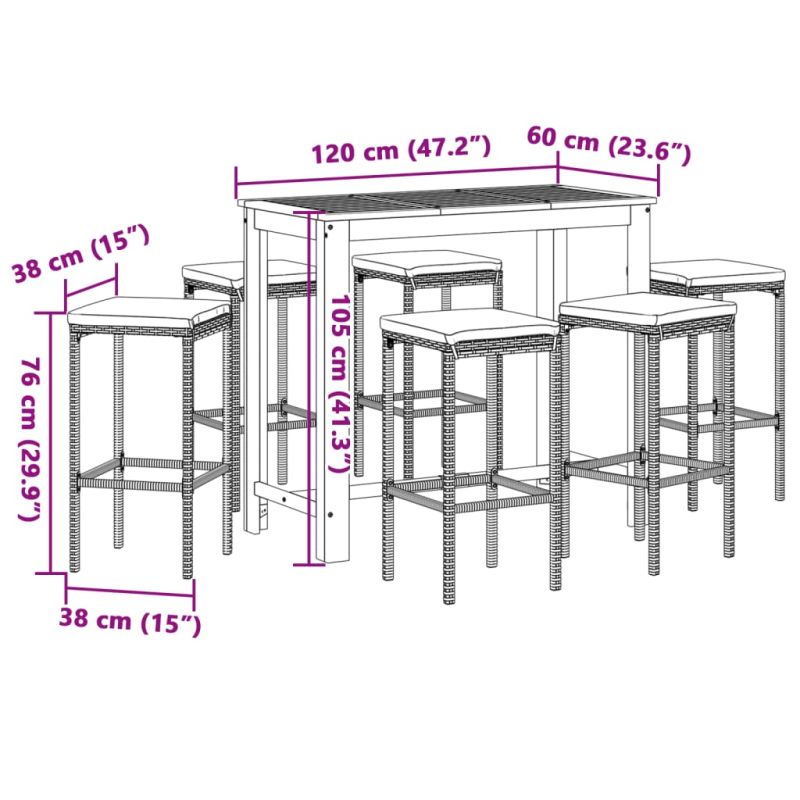 Този градински бар комплект с елегантен и съвременен дизайн ще бъде чудесен избор за хранене или почивка в градината. Издръжлив материал: PE ратан, известен също като полиратан, е здрав синтетичен материал с малко необходима поддръжка, който прилича на естествен ратан. Той е лек, лесен за почистване и често се използва за външни мебели поради своята издръжливост и устойчивост на атмосферни влияния. Изработени от лек PE ратан, тези бар столове са здрави и лесни за преместване. Стабилен плот: Масивното акациево дърво е красив естествен материал. Акациевото дърво е тропическа твърда дървесина, която е плътна, здрава и издръжлива. Изработена от масивно акациево дърво, тази бар маса е здрава и стабилна. Можете да поставите леки закуски, напитки и всякакви любими декорации. Удобно изживяване при седене: Гъсто подплатените възглавници на седалката и вградените подложки за крака добавят допълнителен комфорт при седене на табуретката. Калъф, който може да се сваля и може да се пере: Тези възглавници за седалки имат подвижни калъфи за лесно пране и поддръжка. Добре е да се знае:За да сте сигурни, че вашите външни мебели ще останат красиви, ви препоръчваме да ги защитите с водоустойчиво покривало. Максимално 110 кг на седалка. Съобразете се с риска от открит огън и други източници на силна топлина в близост до продукта.