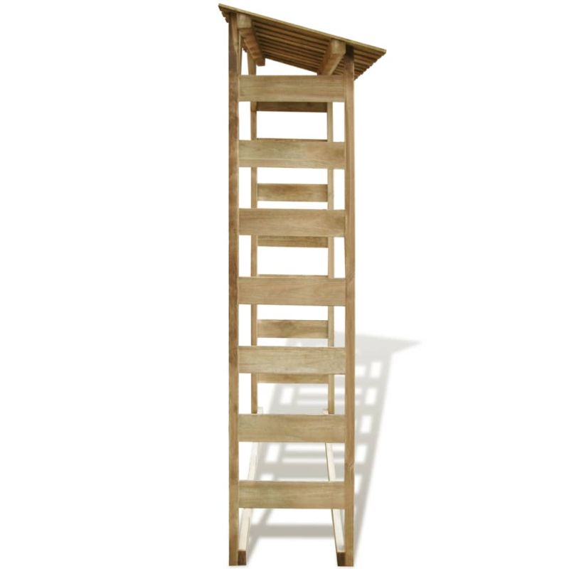 Този навес за съхранение на дърва за огрев представлява ефективно решение за съхраняване на голямо количество дървени трупи. Този складов навес за съхраняване на дърва за огрев е изработен от висококачествена, импрегнирана под налягане борова дървесина, което го прави много здрав, издържлив и устойчив на гниене. Навесът има наклонен покрив, който предпазва дървата за огрев от дъжд и сняг и страни с напречни летви, поставени така, че да позволяват достатъчно циркулация на въздуха, както и повдигнати над земята летви, за да се поддържат дървата вентилирани и сухи. Монтажът е лесен. Моля, имайте предвид, че дървеният материал е естествен продукт и може да съдържа леки несъвършенства.