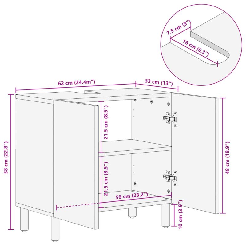 Този шкаф за мивка за баня е предназначен да бъде чудесно допълнение към вашата баня, придавайки ѝ ретро и елегантен вид! Масивна мангова дървесина: Масивната дървесина от манго е здрава тропическа дървесина, от която се произвеждат здрави мебели. Красивите ѝ дървесни шарки правят всяка мебел малко по-различна от следващите. Изработен от масивно мангово дърво, шкафът за мивка е издръжлив и стабилен.Достатъчно място за съхранение: Тоба обзавеждане за баня предлага достатъчно място за съхранение, където да държите вашите принадлежности добре организирани и подръка.Практичен плот на шкафа: Горната част на шкафа за мивка е снабден с дупка, така че е идеален за поставяне на мивката.Здрави крака: Железните крака добавят здравината и стабилността на шкафа за баня. Внимание:За да предотвратите преобръщане, този продукт трябва да се използва с предоставеното устройство за закрепване на стена.