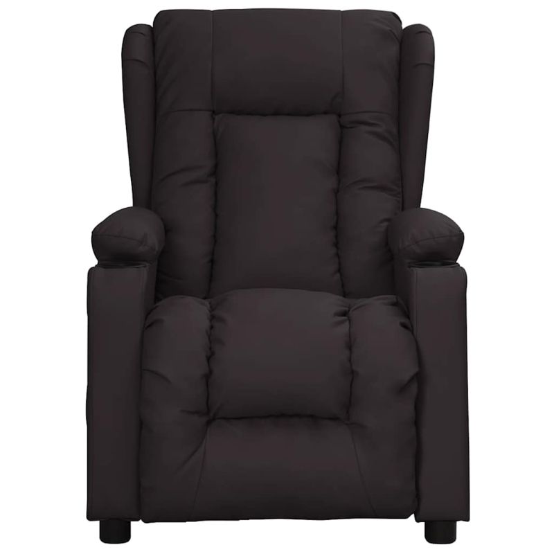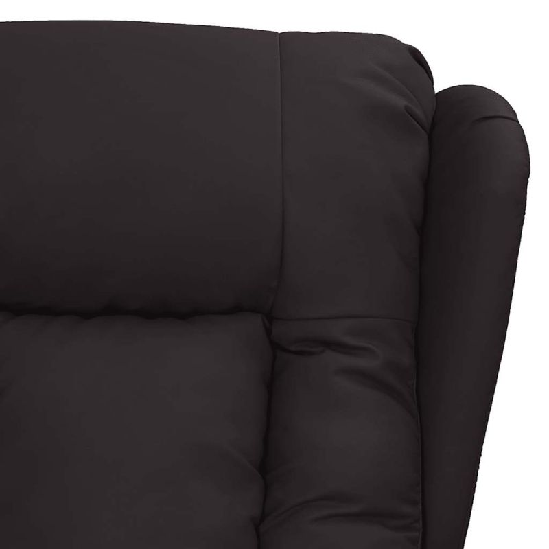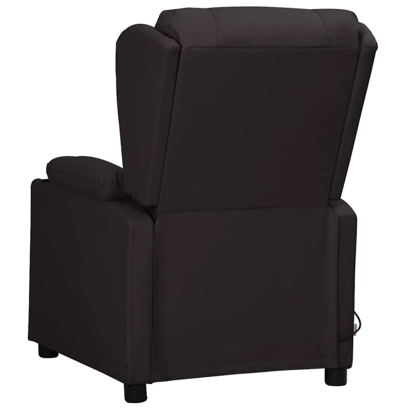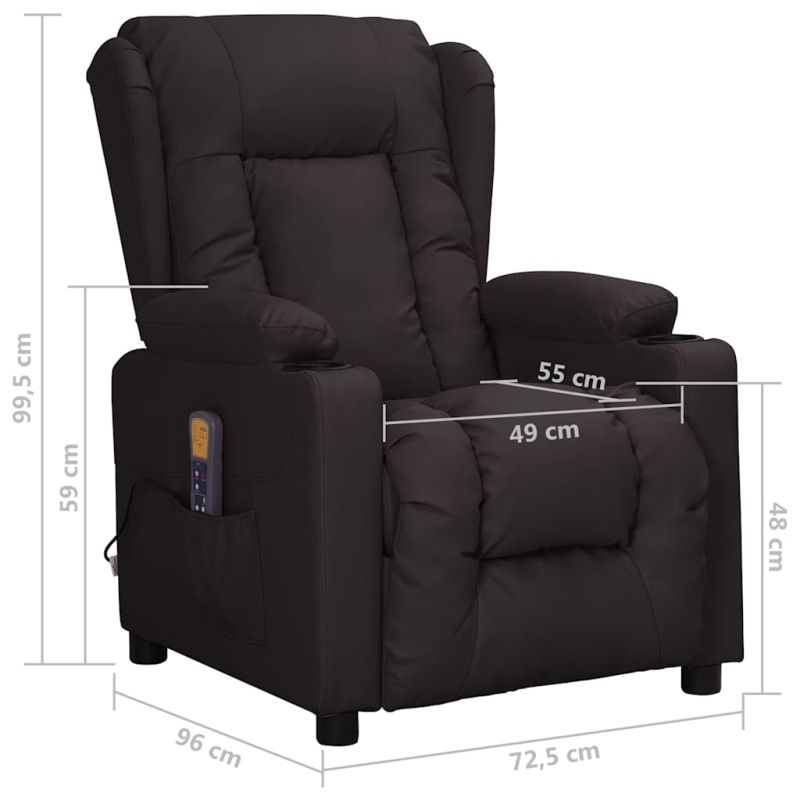 Облегнете се и се отпуснете в този изключително комфортен масажен стол! Функция за ръчно накланяне: Накланящият се стол е специално проектиран с 3 позиции на наклон, така че да можете да регулирате ръчно облегалката и поставката за крака според вашето удобство.Функция за вибрация: Представените 6 масажни точки ви позволяват да изпитате по-целенасочен масаж. Освен това включеното ръчно управление ви позволява да избирате различни програми за масаж. Функцията за масаж се захранва от USB конектора, но сертифицираният 5V USB източник на захранване не е включен.Удобно седене: Дебело подплатената седалка, облегалката и широките подлакътници, покрити с изкуствена кожа, осигуряват уютно и топло усещане, което ви кара да се чувствате като в прегръдка, докато седите. Изкуствената кожа е много издръжлив материал. Устойчива е на петна, което я прави лесна за почистване с влажна кърпа. Гладката повърхност също така придава луксозен вид и красотата на истинската кожа.Здрава и стабилна рамка: Рамката, изработена от дърво и метал, осигурява здрава структура и стабилност. Този накланящ се фотьойл е удобен и издръжлив.