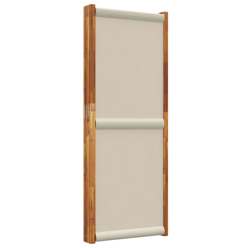 Тази преграда за стая е идеална за създаване на отделна частна зона или част във вашето вътрешно или външно жилищно пространство. Устойчив материал: Масивното акациево дърво е красив естествен материал. Акациевото дърво е тропическа твърда дървесина, която е плътна, здрава и издръжлива. Здравият текстил също е устойчив на атмосферни влияния и лесен за почистване.Гъвкав и лесен за сгъване: Всяка преграда е свързана с поцинковани панти и може лесно да се сгъва до известна степен според вашите нужди, за да спестите място.Многофункционален: Този параван за уединение може да се използва за декорация, както и за преграда. Той е идеален за отделяне на зона за уединение или създаване на допълнително пространство.
