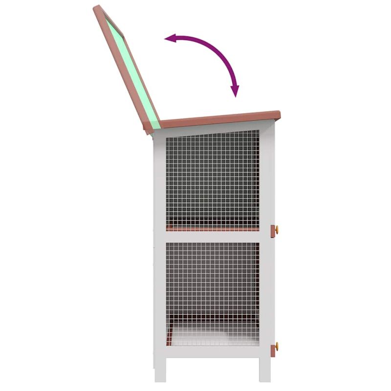 Тази качествена клетка на 2 нива е предназначена за малки животни и най-вече зайци. В нея зайците могат да играят, да се упражняват и в същото време да бъдат в безопасност. Клетката за зайци осигурява на вашите домашни любимци голямо пространство за упражнения, докато здравата метална мрежа помага за предотвратяване на пакости и неочаквани злополуки. Същевременно телената мрежа ви позволява да наблюдавате домашните любимци, а на тях им позволява да наблюдават околността и да получават достатъчно чист въздух. Клетката е изработена от висококачествена дървена рамка, която я прави здрава и устойчива за дълги години на употреба. Зеленият покрив предпазва от дъжда, докато затвореното кубично отделение гарантира удобен сън. Двете издърпващи се тави правят почистването лесно. Вратите се затварят лесно и се заключват с плъзгащи резета. Тази дървена клетка за зайци е идеална за малки домашни любимци. Важна забележка: Препоръчваме ви да поставите клетката за зайци под навес. Това ще удължи експлоатационния ѝ живот.