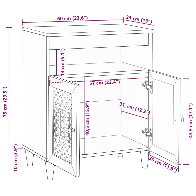 Този дървен бюфет комбинира модерен дизайн с невероятна функционалност, което го прави идеален за пространства, нуждаещи се от допълнително съхранение. С минималистичния си вид и изчистените линии, е фантастично допълнение към съвременните всекидневни. Правоъгълната форма и гладките му повърхности му придават елегантен вид и е построен, за да издържи. Ще откриете достатъчно място, за да държите всичко подредено. Издръжливи материали: Изграден от масивно мангово дърво, което е известно със своята здравина и хубав вид. Инженерната дървесина добавя стабилност, така че бюфетът е здрав и привлекателен. Обширно пространство за съхранение: С плоските повърхности на вратите и рафтовете, имате много място за подредба на вещите си. Гладките вратички се отварят към обширни отсечки, където можете да съхранявате книги, подложки и каквото друго имате. Практични компоненти: Има стабилни крака, които осигуряват солидна опора и удобни дръжки за лесен достъп. Проектиран е така, че да улеснява стигането до вашите неща, докато остава стабилен на различни повърхности. Лесна поддръжка: С опростен дизайн, грижата за него е много лесна. Просто го забърсвайте с кърпа от време на време, за да изглежда отлично. Без сложни детайли, което означава минимални усилия за поддържане на добрия вид. Незабавен монтаж: Този бюфет се сглобява лесно, просто си вземете приятел и отвертка. Дизайнът предлага безпроблемно сглобяване, така че можете веднага да започнете да го използвате.