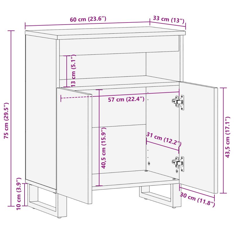 Този страничен шкаф е страхотно съчетание от функционалност и стил, което го прави ценен елемент за всяка домашна обстановка. Изработен е от солидно мангово дърво, което предлага както естествена красота, така и дълготрайност за тези, които искат удобство, без да жертват стила. Компактният му дизайн е идеален за всекидневни, спални или коридори, предоставяйки място за съхранение, без да заема излишно пространство. Перфектно допълва интериора, запазвайки уютната атмосфера. С плавните линии и изящната повърхност, той е и практичен, и декоративен елемент в дома ви. Солидно мангово дърво: Шкафът е изработен от качествено мангово дърво, което му придава здравина и красив, топъл вид. Този материал не само че добавя стил с естествените си шарки, но е и устойчив на износване, осигурявайки дълготрайна полза. Манговото дърво е и екологично, което прави този шкаф подходящ за съзнателни собственици. Конфигурации за съхранение: Шкафът предлага многофункционални решения за съхранение с просторни отделения и вратички, идеални за организиране на домашни предмети. Независимо дали съхранявате книги, малки електроника или декорации, тези отделения са чудесен начин за поддържане на реда в пространството. Проектиран е така, че да осигурява лесен достъп и да прикрива всичките ви принадлежности. Адаптивност на дизайна: Със стилните си детайли и качествено покритие, страничният шкаф се вписва идеално в различни интериори, от модерни до ръчно изработени. Компактният му размер е подходящ за по-малки пространства и върви прекрасно с всеки декор. Минималистичният му вид се адаптира лесно, удовлетворявайки както функционалните, така и естетическите нужди. Многофункционално използване: Този шкаф е прекрасен за всякакви части от дома ви, като предлага стилни решения за съхранение на нужните места. В хола може да се използва за телевизионен организатор, в спалнята за съхранение на дрехи или бельо, а в антрето за стилно подреждане на аксесоари. Поддържа реда, ставайки важен елемент в интериорния дизайн на вашия дом. Грижа и поддръжка: Лесната поддръжка запазва шкафа в отлично състояние. Редовното прахосване с мека кърпа ще предотврати повреда и ще поддържа блясъка му. Избягвайте прекомерното излагане на пряка слънчева светлина, за да запазите красивите нюанси на дървото и осигурете дълготрайна красота. Периодично променяйте положението му, за да избегнете неравномерно износване.