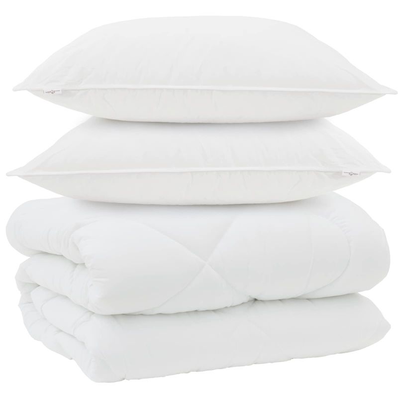 Този комплект зимна завивка и възглавници е абсолютният комфорт за студените месеци. С модерен и прост дизайн, той променя всяка спалня в уютно местенце. Ясният бял цвят пасва на различни декорации, създавайки приятно място за отдих и релакс. Представи си как се гушкаш в мекото му прегръщане, осигурявайки топлина за спокоен сън. Перфектен е за всеки, който иска да вдигне настроението в спалнята с комфорт и стил. Материали: Премиум микрофибърът, от който са направени завивката и възглавниците, е супер мек и гладък, предоставящ луксозно изживяване при сън. Микрофибърът е известен със своите леки, но много топли свойства, идеални за зимно легло без тежестта на традиционните запълвания. Включени компоненти: Комплектът включва една зимна завивка и две пухкави възглавници, всички вакуумно опаковани за твое улеснение. Възглавниците могат да се потупат, за да възстановят формата си и осигуряват височина и подкрепа. Функции / Дизайн: Дизайнът с квадратни шевове не само изглежда добре, но и помага за равномерното разпределение на запълването, предотвратявайки образуването на буци и осигурявайки последователна топлина през нощта. Това е стилна и практична опция за модерни интериори. Препоръчителни употреби: Идеален за спални, комплектът осигурява супер комфорт за студените зимни вечери. Модерният му стил и бял цвят лесно се съчетават с различни теми в стаята, правейки го универсално допълнение за всеки дом. Поддръжка: Можеш да переш на 30°C, което прави поддръжката лесна и безпроблемна. Просто ги мий с подобни цветове и избягвай агресивни химикали, за да запазиш мекотата и качеството им.