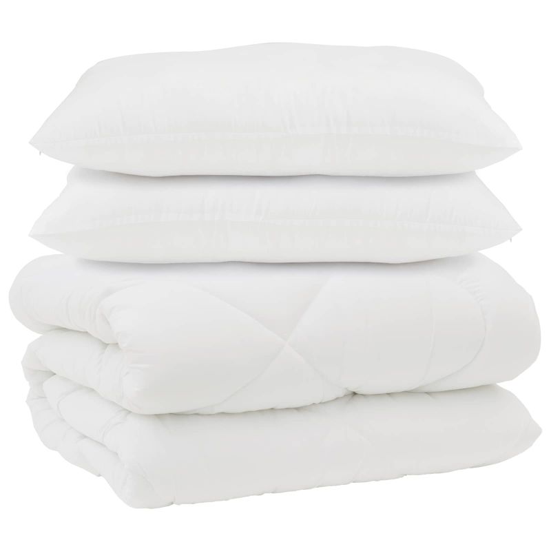 Това одеяло с възглавници носи комфорт и стил в твоята спалня, обгръщайки те в топлина и изтънченост. Неговият модерен дизайн с чисти линии придава шикозен вид, идеален за хора, които ценят простотата и практичността. Одеялото от мек микрофибър и пух предлага луксозно усещане, превръщайки спалнята ти в уютно място. Потопи се в него и се отпусни след дългия ден, а дишащият материал гарантира освежаващ сън през нощта. Луксозни материали Микрофибър и пух осигуряват изключителна мекота и топлота. Микрофибърът е издръжлив и лесен за поддръжка, а пухът добавя разкош. Комбинацията им предлага чудесна изолация за студеното време, подобрявайки съня ти на ново ниво на комфорт. Внимателно проектирани компоненти В комплекта има одеяло и две възглавници, пълнени с полиестерно влакно. Този лек, но топлоизолиращ материал ти осигурява уют през цялата нощ. Възглавниците, с приятна текстура, повишават комфорта и ти предлагат легло, което е истинско убежище. Функционален дизайн С тапицерията от квадратни шевове, oдеялото е визуално интересно и предотвратява скачането на пълнежа, задържайки равномерна топлина. Дишащият материал насърчава циркулацията на въздуха и намалява прегряването за качествен сън. Многофункционален Перфектен за спалня, този комплект одеяло и възглавници е предназначен за вътрешна употреба. Подходящ за всеки, той превръща всяка спалня в спокойно място, където стилът и комфортът се съчетават. Лесна поддръжка Можете да го пере в машина на 30°C, така че поддръжката му е супер лесна. Просто го хвърли в пералнята у дома и ще имаш удобно и чисто легло. Спокойният дизайн ти позволява да запазиш свежестта в спалнята с минимални усилия.