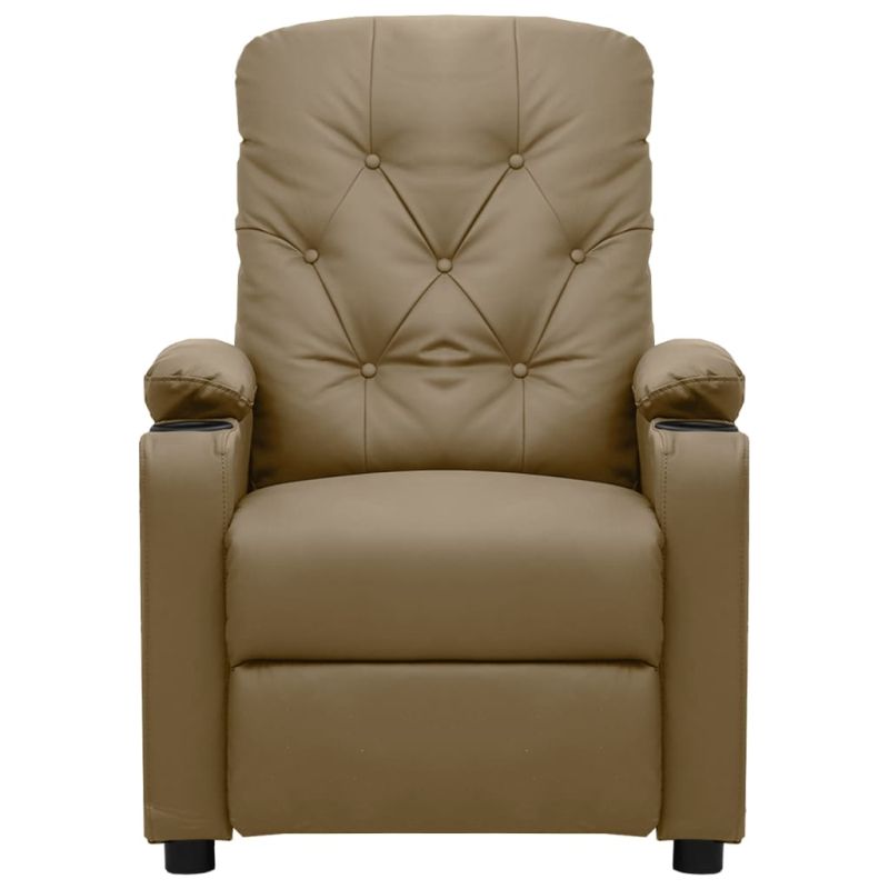 Облегнете се и се отпуснете в този изключително комфортен наклоняем стол! Функция за ръчно накланяне: Накланящият се стол е специално проектиран с 3 позиции на наклон, така че да можете да регулирате ръчно облегалката и поставката за крака според вашето удобство.Удобно седене: Дебело подплатената седалка, облегалката и широките подлакътници, покрити с изкуствена кожа, осигуряват уютно и топло усещане, което ви кара да се чувствате като в прегръдка, докато седите. Изкуствената кожа е много издръжлив материал. Устойчива е на петна, което я прави лесна за почистване с влажна кърпа. Гладката повърхност също така придава луксозен вид и красотата на истинската кожа.Здрава и стабилна рамка: Рамката, изработена от дърво и метал, осигурява здрава структура и стабилност. Този накланящ се фотьойл е удобен и издръжлив.