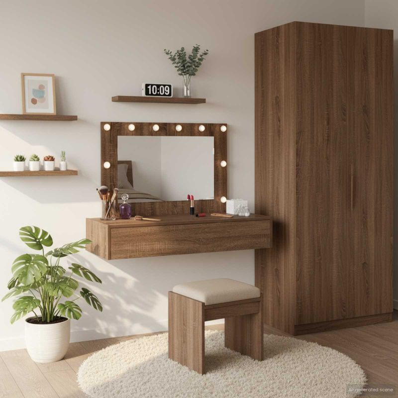 Тази модерен тоалетка е страхотен пример за съвременен дизайн с елегантни линии и практична форма. Перфектна е за всяка спалня, съчетаваща стил и полезност, предлагайки фънки микс от елегантност и функция. С правоъгълната си форма добавя шик в модерните интериори и предлага достатъчно място за съхранение. Инженерна дървесина: Тоалетката е направена от здраво инженерно дърво, което осигурява дълготрайност и издръжливост. Красивият й вид внася стил в стаята, правейки я важен акцент в съвременните интериори. Изборът на материал гарантира здравина без да се жертва дизайна. Матова рамка: С матово покритие, тоалетката изглежда шикозно с ненатрапчиво изящество. Този избор не само добавя елегантност, но и ограничава отблясъците, създавайки спокойна атмосфера в спалнята. Матова повърхност е устойчива на отпечатъци. Достатъчно опции за съхранение: С умно проектирани чекмеджета, тоалетката предлага удобно решение за подреждане на козметика, бижута и още. Лесното им отваряне позволява лесен достъп и поддържа вид, който изглежда спретнат, дори когато са затворени. Интегрирано плоско огледало: С плоска, отразяваща повърхност, огледалото предлага точни отражения за всяка сутрешна рутина. Простият му дизайн подчертава модерен вид на тоалетката, служейки и за практична и за декоративна цел. Съвместима с модерен декор: Чистите линии и минималистичният стил я правят идеална за съвременни интериори. Без значение дали е част от по-голям комплект или самостоятелна мебел, тоалетката лесно се вписва в разнообразие от дизайнерски предпочитания и теми.