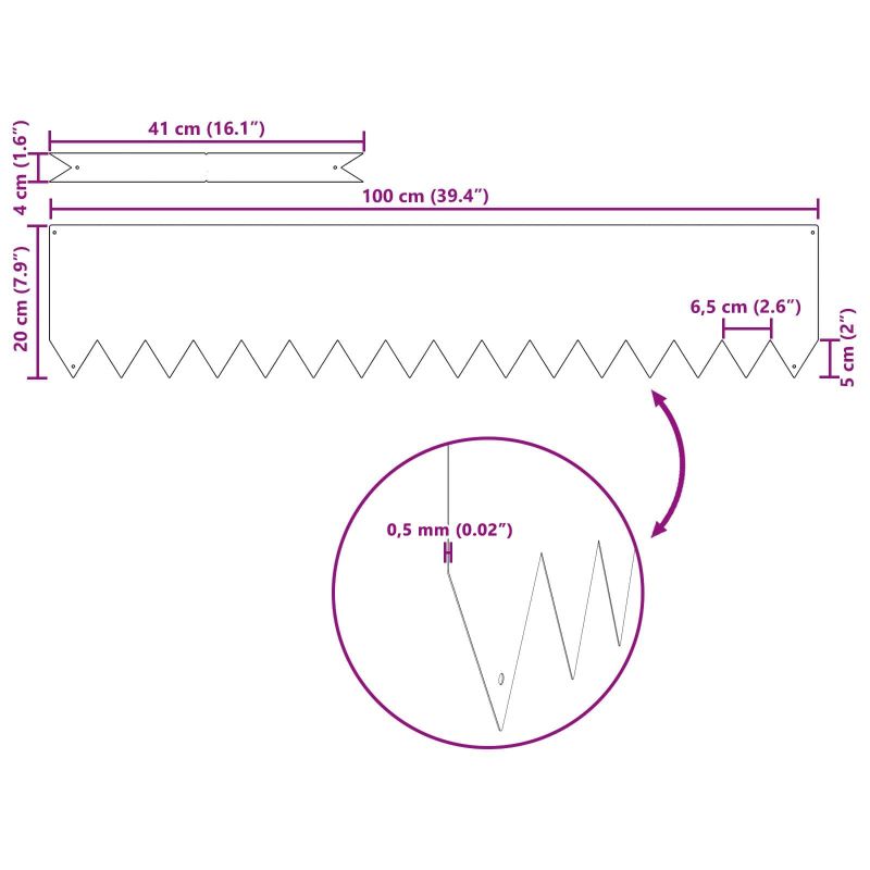 Този градински бордюр предлага стилно и удобно решение за разделяне на местата във външната ви зона. Идеален е за градини и тераси, като създава ясна линия между тревата, цветята и пътеките, организирайки пространството и придавайки му естетика. Модерният дизайн се вписва лесно в различни стилове и подобрява общия вид на градината, правейки поддръжката по-лесна. Устойчив материал: Бордюрът е направен от издръжлив материал, който не се поддава на времето. Проектиран да издържа, той запазва формата и вида си независимо от дъжд, слънце или вятър, предоставяйки надеждност през всички сезони. Модерен дизайн: С чисти линии и минималистичен стил, този бордюр придава съвременен вид на вашите открити пространства. Простият и ефективен дизайн добавя нотка на лукс към всяка градина или тераса. Подобрена функция: Този бордюр осигурява ясно разграничение между различни зони, предпазвайки пътеките от нахлуваща трева. Предлага естетически и практични ползи, намалявайки усилията по поддръжка и подобрявайки визията на ландшафта. Универсална употреба: Идеален за алеи, около цветя или в зоните на патио, този бордюр е адаптивен към разнообразие от оформления и стилове на градинарство. Неговият елегантен изглед и здравина го правят подходящ за всякакви резидентни и комерсиални ландшафти. Основна инсталация: Монтажът е лесен и изисква чук и помощ за стабилно поставяне. Процесът на инсталация гарантира, че бордюрът остава сигурен и функционален, осигурявайки уплатнени граници на вашите открити зони.