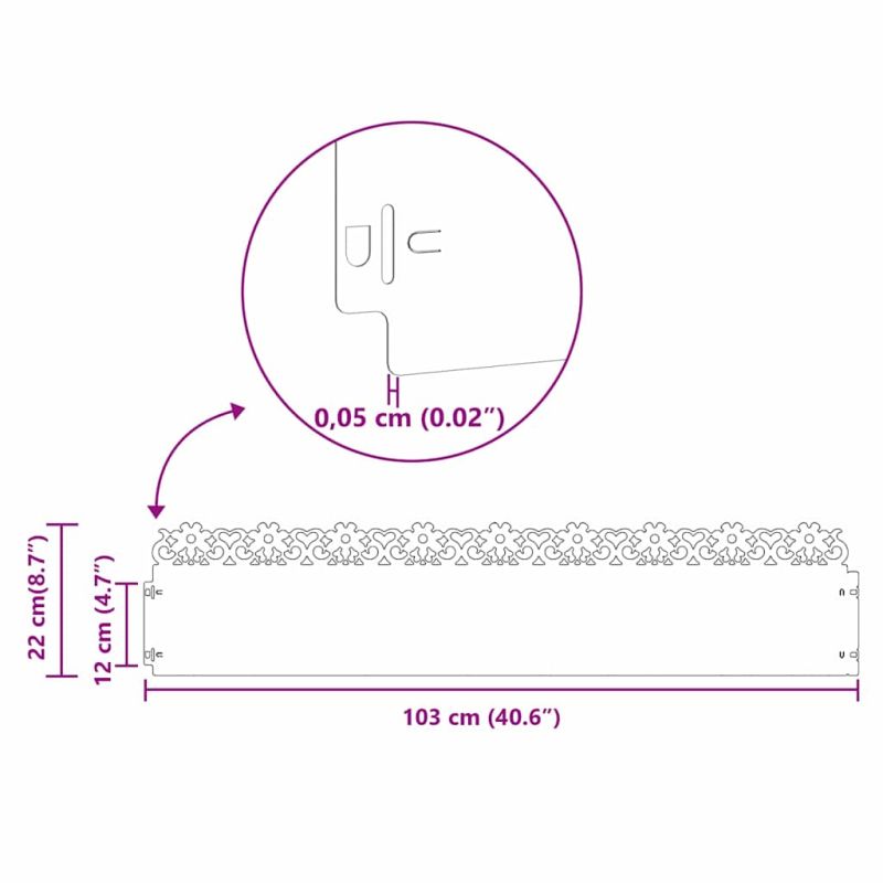 Това елегантно метално ограждане за трева предлага стилно решение за оформяне на градински легла и пътеки, лесно сливайки се с различната ландшафтна среда. Със своите изчистени линии и минималистичен стил, то подобрява визуалната стойност на градините и терасите, предлагайки форма и функция. Осигурете добре организирано открито пространство и добавете архитектурен елемент към градината. Създадено за хора, които ценят простотата в дизайна, това ограждане съчетава привлекателност с практичност. Издръжливи материали Изработено от здрава метална конструкция, което гарантира, че огражденията ви ще устоят на всякакви метеорологични условия. Металът осигурява дълготрайност, дори при много екстремни условия. Модерен стил С чисти и елегантни линии, ограждането е чудесно допълнение към съвременни градини и мебели, предлагаща ненатрапчива елегантност. Практическа функционалност Ограничава разпространението на тревата и осигурява ясна граница между тревната площ и цветните лехи или пътеки, поддържайки градината подредена. Лесна инсталация Монтажът изисква двама души и отвертка, предлагаща лесен начин за постигане на професионални резултати в градината. Инструкции за поддръжка Можете лесно да поддържате ограждането, само с избърсване с влажна кърпа за премахване на замърсявания.