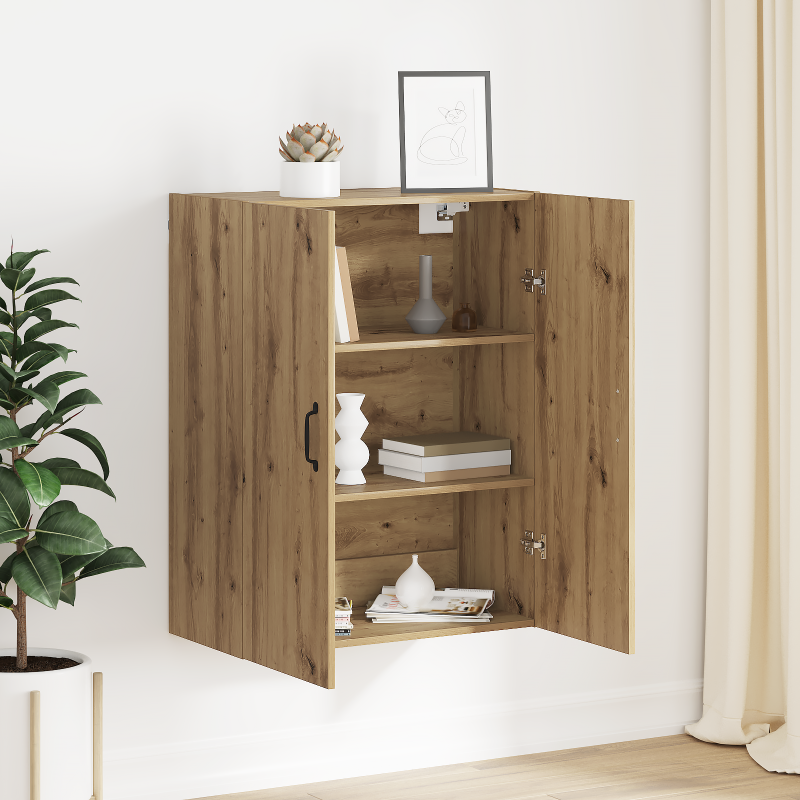 Този стенен шкаф е перфектен за организиране на вашата всекидневна или учебна стая. Със своя модерен вид, той лесно се интегрира в всяко пространство. Стенният дизайн спестява място на пода и предлага достатъчно пространство за книги или други важни неща. Монтажът е лесен - нужни са двама души с отвертка, за да осигурят стабилност. Шкафът има правоъгълна форма и е направен от дълготрайно инженерно дърво, което му придава елегантен вид. Материали: Направен от издръжливо инженерно дърво, този шкаф ще ви служи дълго време без да губи стил. Устойчив е на износване и лесен за почистване. Включени компоненти: Шкафът идва с регулируеми рафтове, врати с панти и стилни дръжки. Всеки елемент е проектиран да улесни живота ви. Характеристики / Функция / Дизайн: Със здравата си конструкция и спестяващ място стенен монтаж, шкафът е перфектен за книги и офис принадлежности. Препоръчвани употреби: Идеален за всяка стая, той съчетава стил и практичност. Подходящ за съхранение на всичките ви вещи, било то книги или декоративни вещи. Грижа и поддръжка: Лесно е! Просто използвайте суха кърпа и избягвайте агресивни химикали, за да поддържате шкафа в отлично състояние.