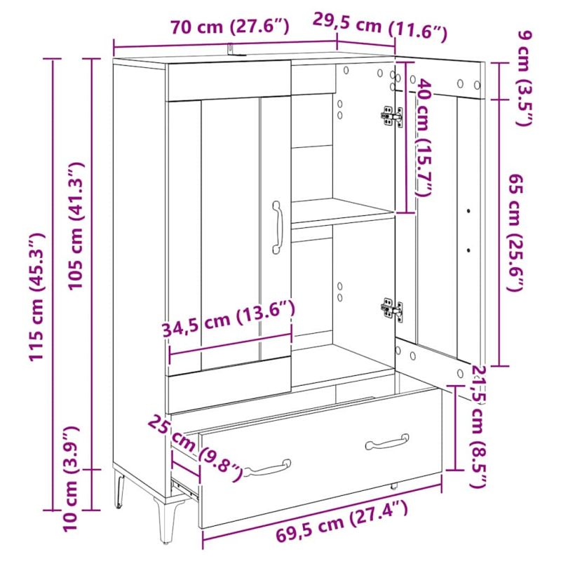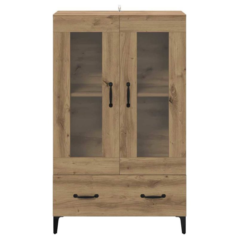 Този високборд от инженерна дървесина е супер удобно и стилно допълнение за всяка модерна всекидневна. Със своите чисти линии и минимална декорация, той се вписва навсякъде. Осигурява много пространство за съхранение с отделения, чекмеджета и рафтове, отговарящи на нуждите ви. Излъчва елегантност и практичност, предлагайки идеално място за вашите ценни вещи, всичко е организирано и под ръка. Материали: Изработен от качествена инженерна дървесина, този високборд е здрав и стилен. Издържа на времето и изглежда добре в съвременната всекидневна. Желязото на краката му осигурява стабилна опора. Включени компоненти: Високбордът има стъклени врати, които добавят елегантност и позволяват да показвате ценни предмети, като същевременно ги пазите. Рафтовете предлагат достатъчно място за организиране на всичките ви неща. Матово завършените дръжки са удобни за ползване. Характеристики/Функция/Дизайн: С различни решения за съхранение, като просторни чекмеджета, този високборд е идеален за подредба на ваши неща. Лесно се почиства с мокра кърпа, което го прави практичен за ползване. Препоръчителни употреби: Идеален за всекидневни, този мебел може да бъде витрина или практично решение за съхранение. Неговият класически стил подхожда на много декорирани пространства. Грижа и поддръжка: За да го запазите красив, просто избърсвайте с влажна кърпа и закрепете на стената за безопасност. Правилната грижа запазва неговия полирано изглед.