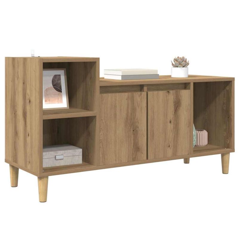 Този ТВ кабинет е перфектният баланс между рустикална елегантност и удобен дизайн. Идеален е за съвременни стаи, добавяйки стил и предоставяйки място за вашите медийни устройства. Правоъгълната форма му позволява да се вписва лесно в различни интериори, създавайки атмосфера на простота и красота. Материал от инженерна дървесина: Изработен от качествен инженерно дърво, този кабинет е издръжлив и устойчив на драскотини, така че ще изглежда добре дълго време. Лесен е за поддръжка и идеален за заети домакинства. Описание на компонентите: С плоскости и врати с панти, кабинетът предлага лесен достъп до хранилището. Конусообразните крака добавят стил, осигурявайки стабилност и модерен вид. Характеристики и дизайн: Повърхностите са лесни за почистване, а врати с панти осигуряват много място за съхранение. Рафтовете предлагат както украсителна, така и складова функция. Препоръчителни употреби: Идеален за стилни всекидневни, кабинетът събира електронни аксесоари, книги и декоративни предмети. Пространството е оптимално за съхранение на DVD, игрови конзоли и медийни плейъри. Поддръжка и грижа: За поддържане на красотата му, избърсвайте с влажна кърпа и следвайте инструкциите за сглобка. Закрепете го за безопасност, особено в домове с деца или домашни любимци.