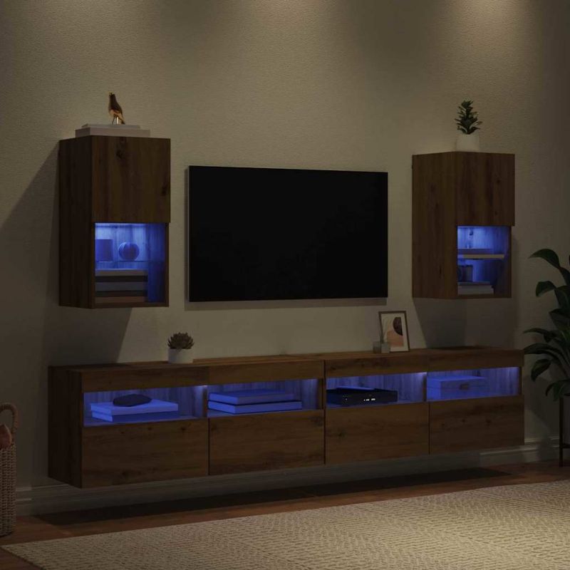 Този модерен телевизорен шкаф предлага стилно решение за съхранение с елегантен дизайн и практичност. Перфектен за хора, които ценят съвременния стил, той е идеален за всяка всекидневна. Комплектът включва инженерна дървесина и стъкло, които придават модерен вид, докато правоъгълната форма предлага достатъчно място за медийни устройства и декорации. Стенният монтаж помага за спестяване на място. Вградените LED светлини добавят уют и подобряват обстановката. Шкафът е универсален и лесен за вписване в различни стилове. Премиум материали: Изработен от инженерна дървесина, шкафът предоставя гладко покритие и здравина, осигурявайки дълготрайност и устойчивост на износване. Материалът поддържа стилна естетика, с добра комбинация от стъклени елементи. Иновативно осветление: Вградените LED светлини с бутон предлагат адаптивна атмосфера. Многоцветното осветление подобрява обстановката, позволявайки на потребителите да настроят средата по желание. Умен дизайн за съхранение: Стенният шкаф с рафтове предлага много място за организаця на медийните устройства и декорации. Вратите предлагат лесен достъп, а инженерната дървесина поддържа чист вид. Лесна инсталация: Сглобяването е за двама с отвертка, следвайки споменатите ясни инструкции за лесен монтаж. Това опростява инсталационния процес за всички любители на DIY. Лесна поддръжка: Инструкциите включват просто избърсване с кърпа и избягване на агресивни химикали, за да се запази шкафът в оптимално състояние. Тези лесни стъпки осигуряват дълготрайно качество на вида на шкафа.
