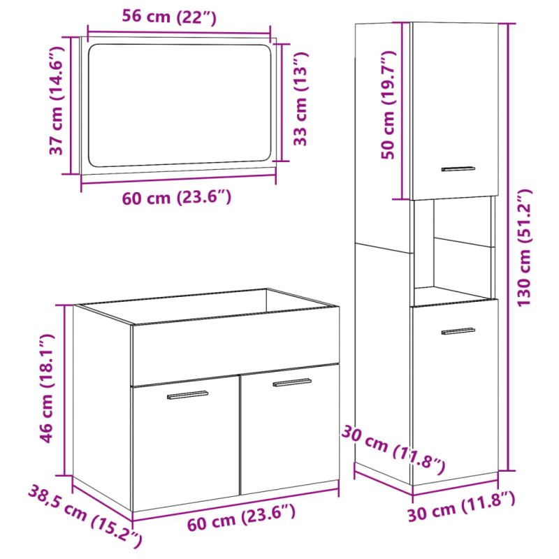 Този комплект мебели за баня е отлично допълнение към вашата баня, придавайки ѝ подредена и впечатляваща визия! Издръжлив материал: Инженерната дървесина е с изключително качество с гладка повърхност и също така се отличава със здравина, стабилност и устойчивост на влага.Достатъчно място за съхранение: Шкафът за съхранение предлага достатъчно място за лесно поставяне на вашите основни тоалетни принадлежности и артикули за баня като сапуни, шампоан, паста за зъби и др.Функция за монтиране на стена: Шкафът за баня и огледалото за грим могат да бъдат монтирани на стена, за да осигурят допълнително място за съхранение. По този начин можете да увеличите максимално пространството на пода и да поддържате чистота.Ясен образ: Стъкленото лице на огледалото осигурява фино и ненарушено отражение, така че е подходящо за гримиране, бръснене или проверка на костюма преди излизане. Добре е да се знае:Мивката не е включена в доставката.Винтовете и дюбелите за стената не са включени. Съветваме ви да намерите и използвате винтове и дюбели, подходящи специално за вашите стени. Ако не сте сигурни, можете да се консултирате с професионалист. Моля, прочетете и следвайте всяка стъпка от инструкциите.