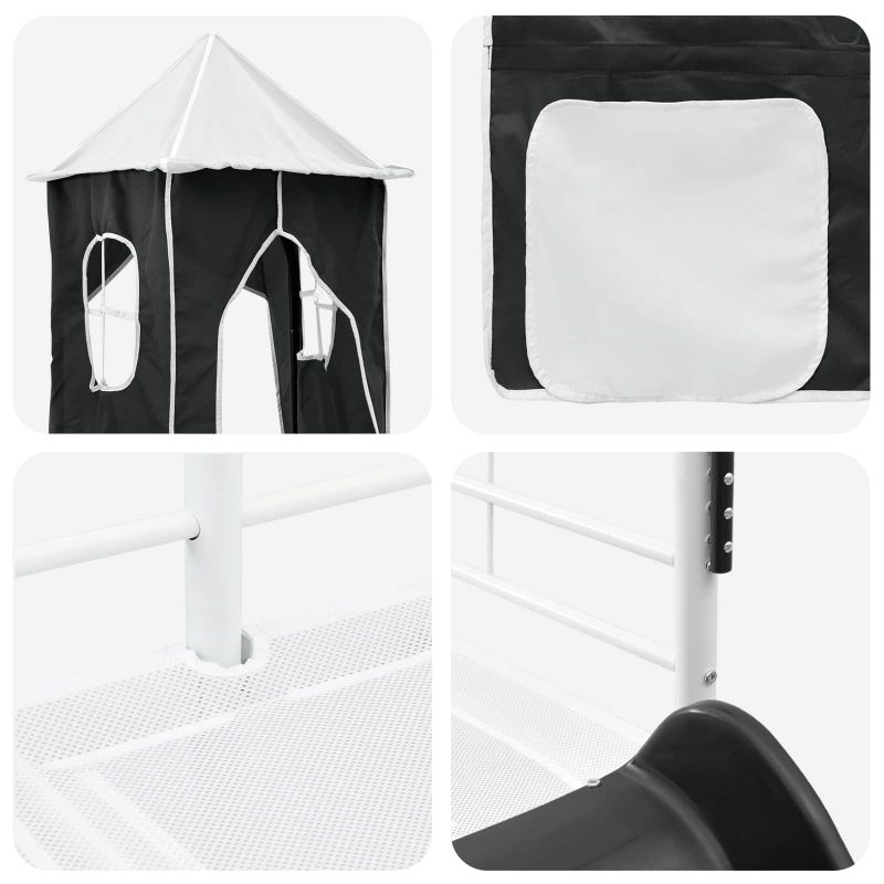 Тази модерна рамка за легло с пердета, арка, пързалка и кула е вълнуващо и практично решение за детски стаи. Стилният дизайн я прави акцент в помещението. С кула и пързалка, времето за лягане става забавно. Отличният дизайн оптимизира пространството, отговаряйки на нуждите на детето с функции, които вдъхновяват въображението. Перфекният микс от красота и практичност я прави идеална за игриви детски стаи. Здрав метален каркас: Изработено от здрав метал, това легло е дълготрайно и поддържа енергични деца. Металната рамка с матово покритие прекрасно вписва в декорите на детските стаи. Проектирано за безопасност и стабилност, устоява на ежедневни приключения. Вълнуваща пързалка и кула: Децата ще обожават вградената пързалка и кула, които превръщат стаите им в игрални площадки. Компонентите насърчават играта и креативността, създавайки приключенска зона за забавление и учене. Функционални завеси за уединение: Леглото идва с ръчно управлявани завеси, които добавят интрига, дарявайки необходимо уединение. Арката прикрива местата на монтажа, за по-добър визуален изглед. Матово покритие: Матово боядисаната рамка на леглото изглежда елегантно, отблъсквайки пръстови отпечатъци и прах. Изчистеният вид лесно се съчетава със съвременни интериори, изискващи минимална поддръжка. Инструкции за поддръжка: Почистването е просто - нужна е само влажна кърпа. Препоръчва се да следвате инструкциите на производителя за сглобяване, така леглото ще служи дълго.