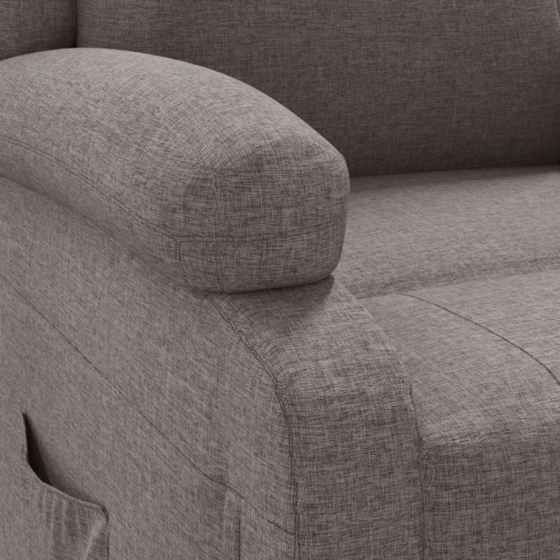 Облегнете се и се отпуснете в този изключително комфортен електрически масажен стол! Електрическа функция за накланяне: Столът с облегалка е оборудван с електрически мотор за функция за накланяне. Разполага с 3 позиции на легнало положение, така че можете лесно да регулирате облегалката и поставката за крака с включеното ръчно управление с 2 бутона според вашето удобство.Функция за вибрация: Представените 6 масажни точки ви позволяват да изпитате по-целенасочен масаж. Освен това включеното ръчно управление ви позволява да избирате различни програми за масаж. Функцията за масаж се захранва от USB конектора, но сертифицираният 5V USB източник на захранване не е включен.Удобно седене: Дебело подплатената седалка, облегалката и широките подлакътници, покрити с текстил, осигуряват уютно и топло усещане, което ви кара да се чувствате като в прегръдка, докато седите. Тъканта се отличава със семпъл и изчистен вид и е дишаща и издръжлива.Здрава и стабилна рамка: Рамката, изработена от дърво и метал, осигурява здрава структура и стабилност. Този накланящ се фотьойл е удобен и издръжлив.