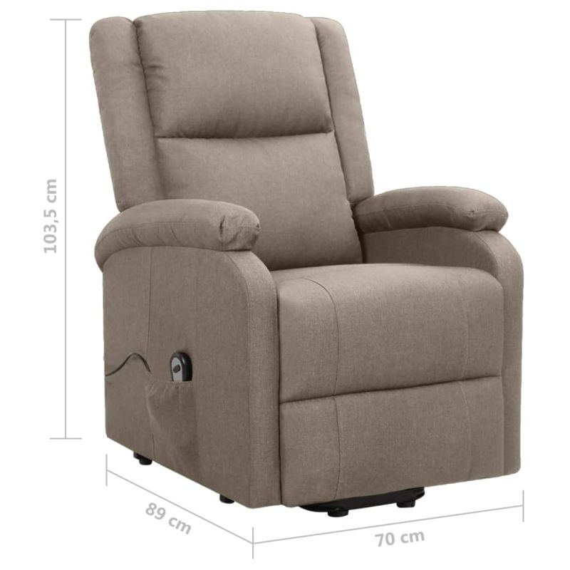 Облегнете се и се отпуснете в този изключително комфортен изправящ стол! Функция за ръчно накланяне: Накланящият се стол е специално проектиран с 3 позиции на наклон, така че да можете да регулирате ръчно облегалката и поставката за крака според вашето удобство.Функция за повдигане: Този стол реклайнер е оборудван с електрически двигател с функция за повдигане. Благодарение на ръчното дистанционно управление с 2 бутона и функцията, която избутва целия стол нагоре, можете лесно да се изправите, без да натоварвате гърба и коленете си.Удобно седене: Дебело подплатената седалка, облегалката и широките подлакътници, покрити с текстил, осигуряват уютно и топло усещане, което ви кара да се чувствате като в прегръдка, докато седите. Тъканта се отличава със семпъл и изчистен вид и е дишаща и издръжлива.Здрава и стабилна рамка: Рамката, изработена от дърво и метал, осигурява здрава структура и стабилност. Този накланящ се фотьойл е удобен и издръжлив.