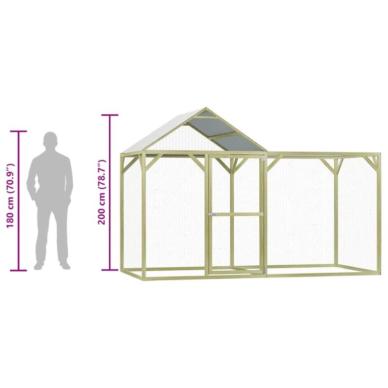 Нашата практична и просторна дървена клетка за пилета е чудесен избор за навес на открито за вашите пилета, кокошки, патици, гъски, както и за много други дребни животни, като ще им осигури комфорт. Изработена от импрегнирана борова дървесина, къщата за кокошки е изключително издръжлива, устойчива на атмосферни влияния и гниене. Изработен от 100% полиестер, покривът е водоустойчив. Снабдена с ключалка, портата разполага с лесна за отваряне заключваща се врата с включени ключалки. В допълнение, благодарение на поцинкованата стоманена решетка, тя ви позволява да наблюдавате животните си. Клетката за пилета трябва да бъде сглобена.