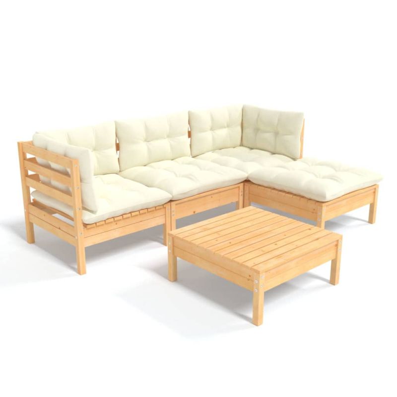 Градински лаундж комплект с кремави възглавници, 5 части, бор